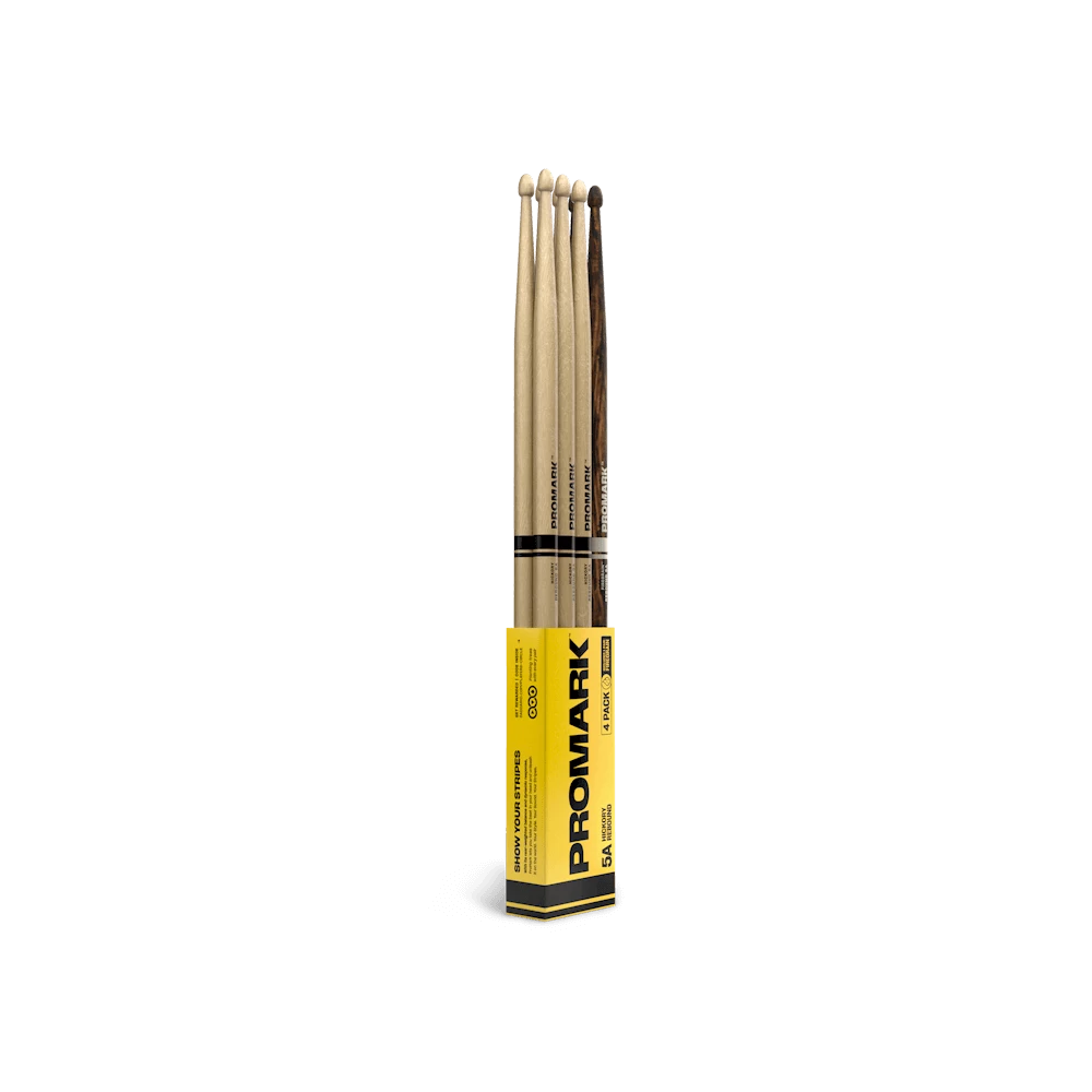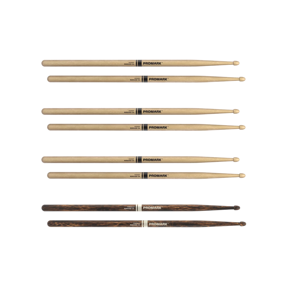 ProMark Bonus Packs deliver quality, reliability, and innovation—all at an incredible value. This 4-pack includes three pairs of our trusted standard Rebound 5A hickory sticks, plus one bonus pair of Rebound 5A FireGrain. Rebound 5A drumsticks feature an acorn tip and long taper, producing a rear-weighted feel that increases agility. With the addition of our exclusive FireGrain treatment, the bonus pair lets you hit harder and play longer, while maintaining the stick’s original weight and balance.