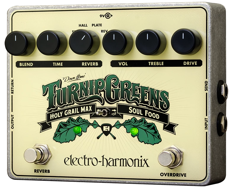 A toggle effect-order switch, located in the middle of the Turnip Greens, selects whether the overdrive or reverb is first in the effects chain. Send and Return jacks let the player insert effects into the signal path between the two. With the switch to the right the signal chain is Soul Food Holy Grail Max which produces a traditional sound familiar to most players. In the left position the signal chain is Holy Grail Max Soul Food. Now the reverb is boosted by the overdrive which, when used in conjunction with pedals in the effects loop, can create very lush textures.The Electro-Harmonix Turnip Greens features an internal switch that lets the player select between true bypass or buffered bypass for the Soul Food section. In true bypass mode, when the Turnip Greens is set to bypass, the input jack is connected directly to the amp jack and nothing else. In buffered bypass mode, the bypass signal passes through a high-quality buffer circuit before it is output from the Amp jack.The Soul Food delivers transparent sounds starting with clean boost and progressing all the way to intense overdrive. Its equally adept at adding punch to a players tone, pushing an amp into saturation or in front of other dirt pedals driving them into new worlds of distortion.The Holy Grail Max provides four carefully crafted reverbs: Spring, Hall, Plate and Reverse. A newly designed analog wet/dry control yields a constant volume curve as the Blend knob is turned from fully dry to fully wet, while also keeping the dry signal analog through the pedal.The pedals left side features the Holy Grail Maxs controls and independent footswitch while the right side is dedicated to the Soul Foods controls and footswitch.The Electro-Harmonix Turnip Greens comes standard with an EHX 9.6-Volt/DC200mA AC Adapter.Get your Electro-Harmonix Turnip Greens Multi-Effect Guitar Pedal today at the guaranteed lowest price from Sam Ash Direct with our 45-day return and 60-day price protection policy.