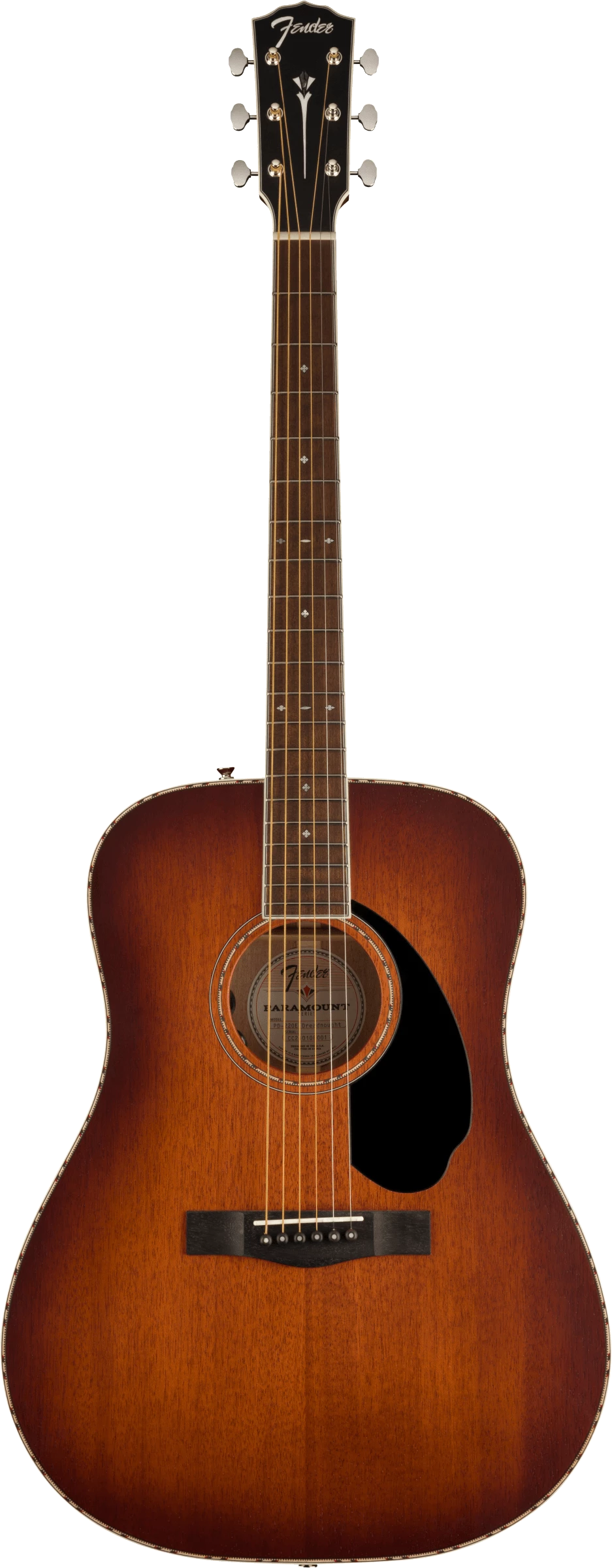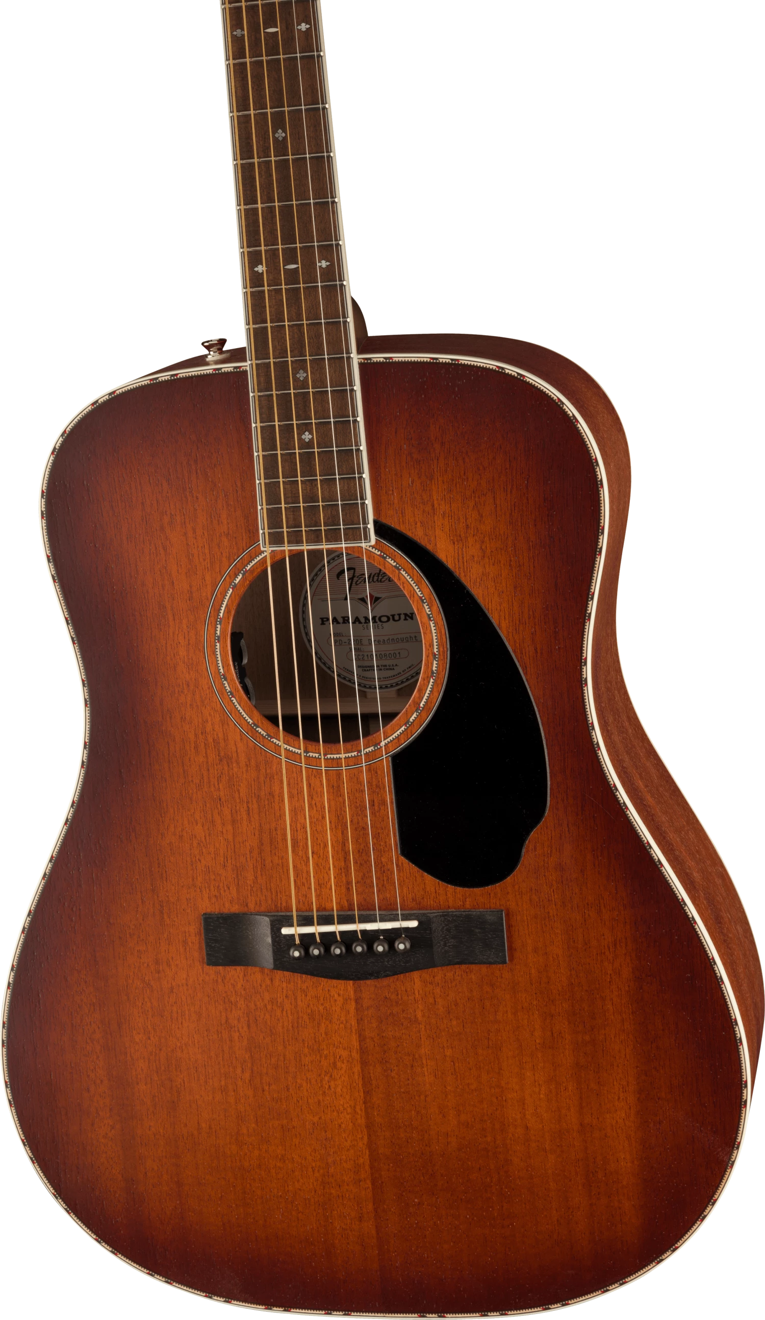 The Paramount PD-220E combines state-of-the-art craftsmanship with vintage-inspired appointments, delivering the best of both worlds. Built with the choice of a solid spruce or solid mahogany top paired with solid mahogany back and sides, the PD-220E features an offset X-bracing pattern that has been carefully refined to optimize resonance and tone. A brand-new Fender and Fishman®-designed Sonitone Plus pickup amplifies the full, balanced tone of the PD-220E’s dreadnought body shape, while the soundhole-mounted controls preserve the vintage aesthetics. Under the top, a body-sensing pickup enhances the soundboard’s vibrations which can then be blended with the undersaddle Sonicore pickup.
