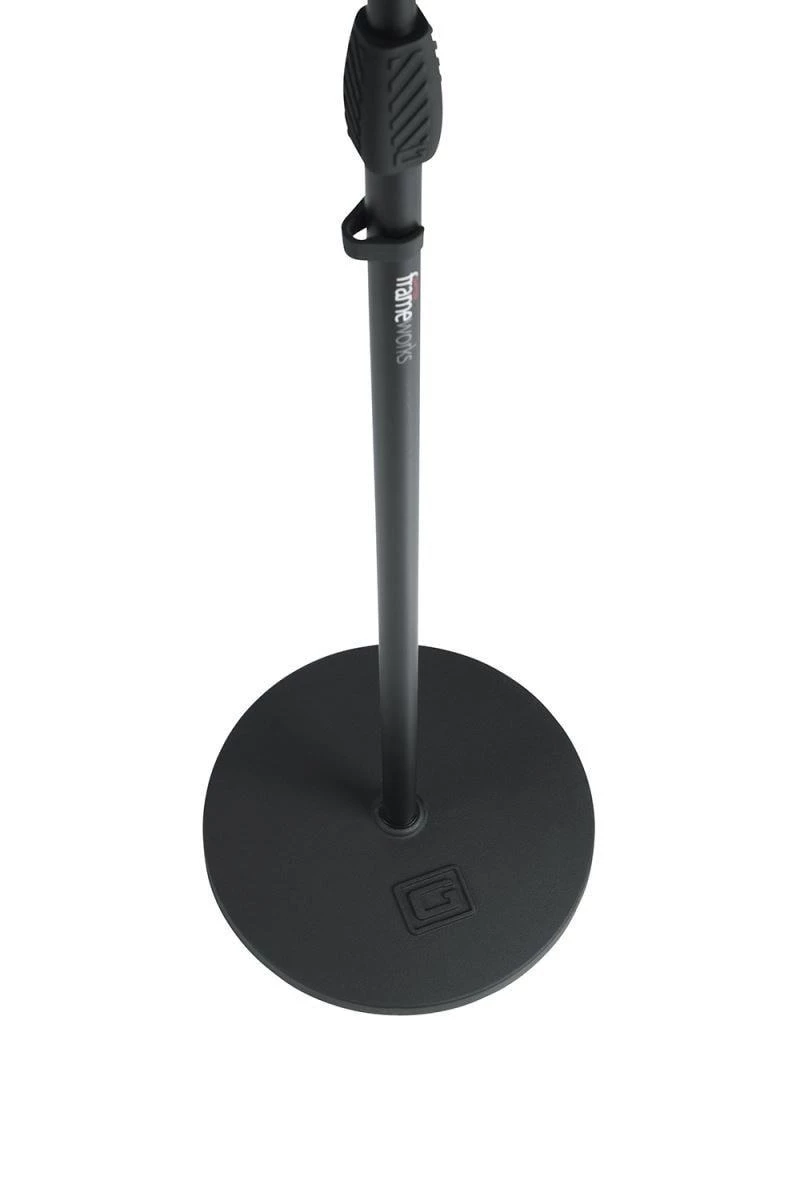 Frameworks roundbase mic stand with 12″ round base and standard twist clutch.