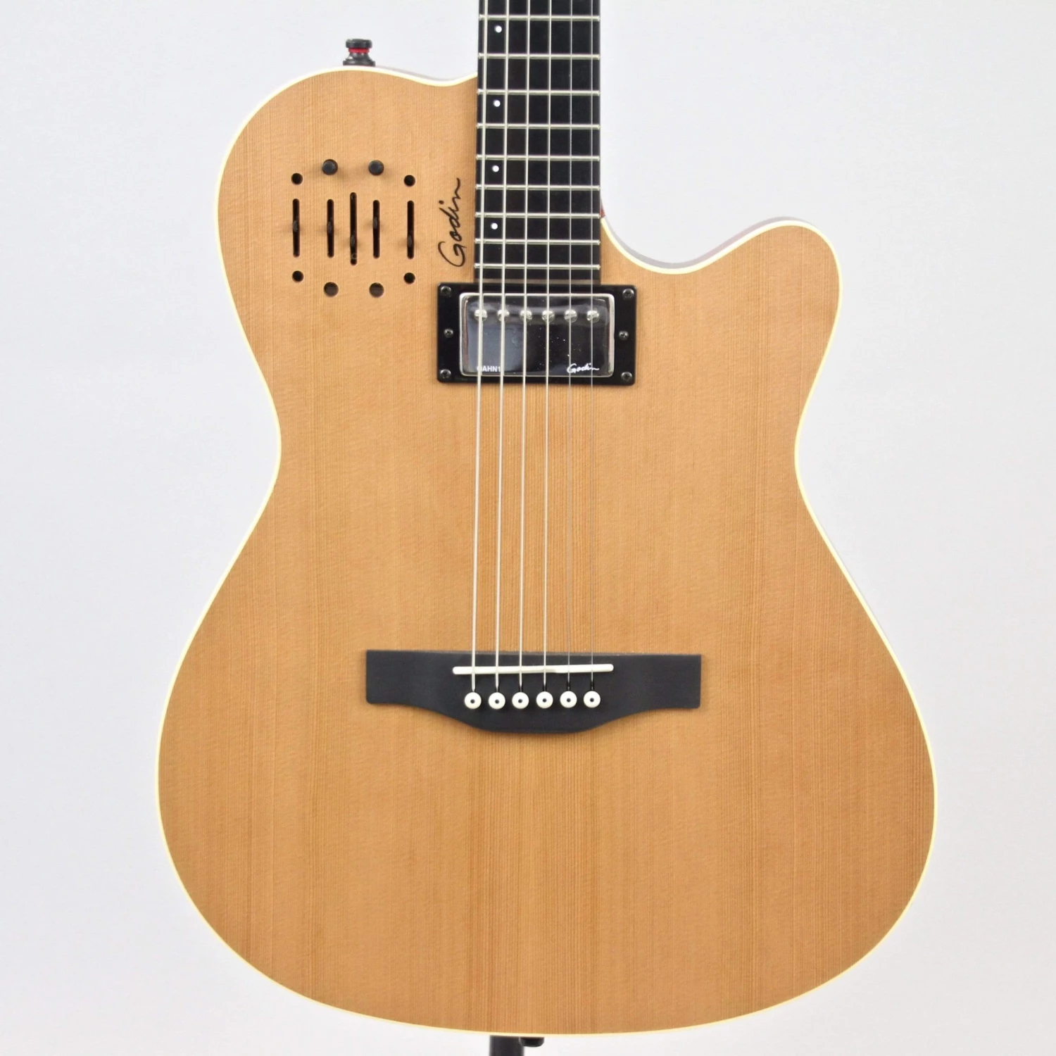 The A6 Ultra continues with the innovative concepts found in all Godin A-series guitars, such as combining amazing plugged-in acoustic sound with the feel of an electric neck, along with a chambered body design that virtually eliminates feedback in live & loud settings. These features stand true and better than ever in the A6 Ultra with the added “Oomph!” and full tone of a Godin humbucker in the neck position. In addition, the undersaddle transducer and dual outputs (acoustic and electric) combine for a huge sound with the help of a Custom Godin preamp, which is voiced specifically for the A6 Ultra. This preamp section enables the player to control their tone via sliders for acoustic volume, treble, mid, bass EQ, and independent controls for the electric humbucker volume, treble, and bass. Whether plugging into the single acoustic mix or via both outputs, controlling your tone is at your fingertips. And, the A6 Ultra delivers in all styles of music, from jazz to rock, to country, and not to mention being a great slide guitar for blues.