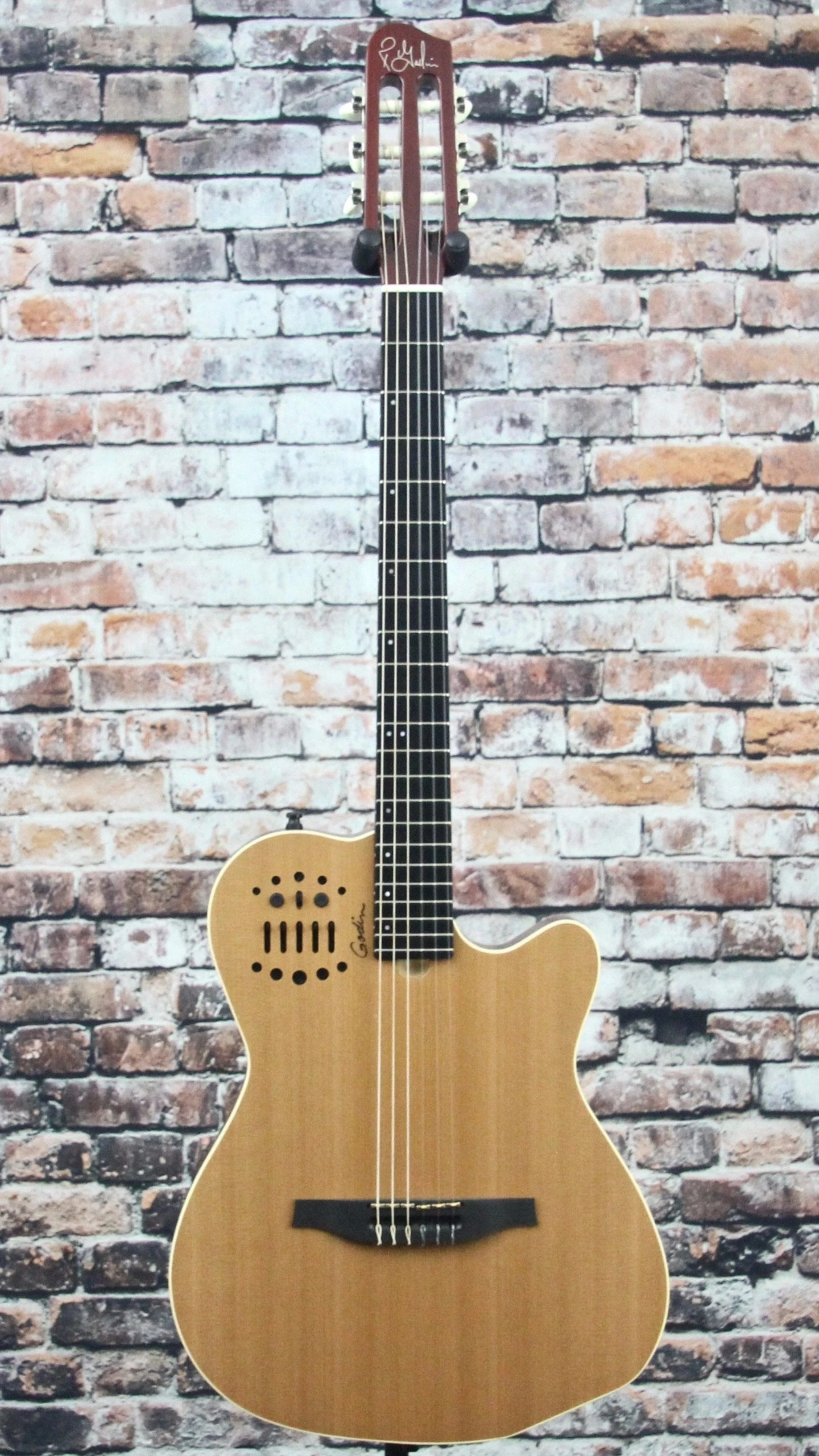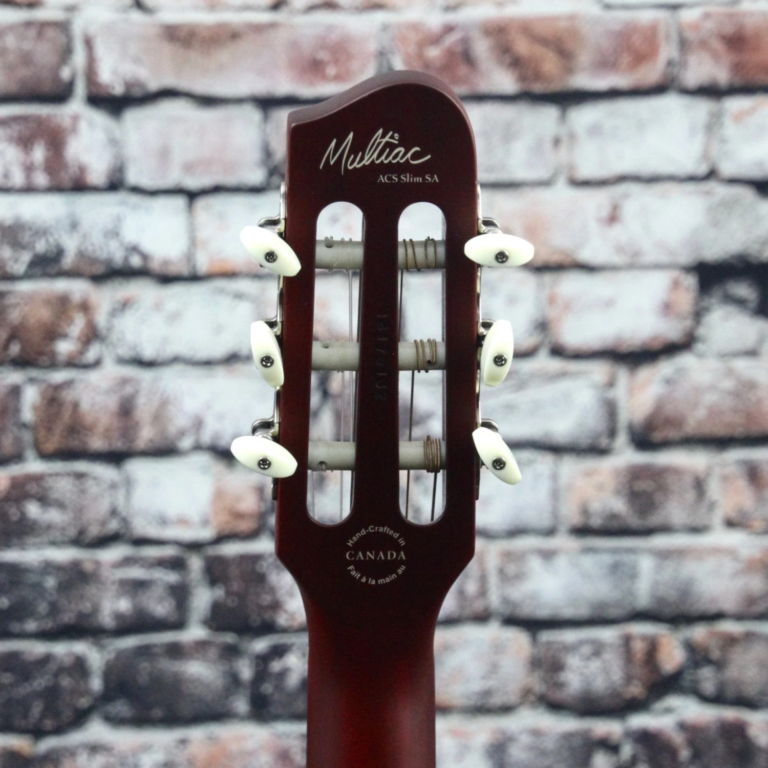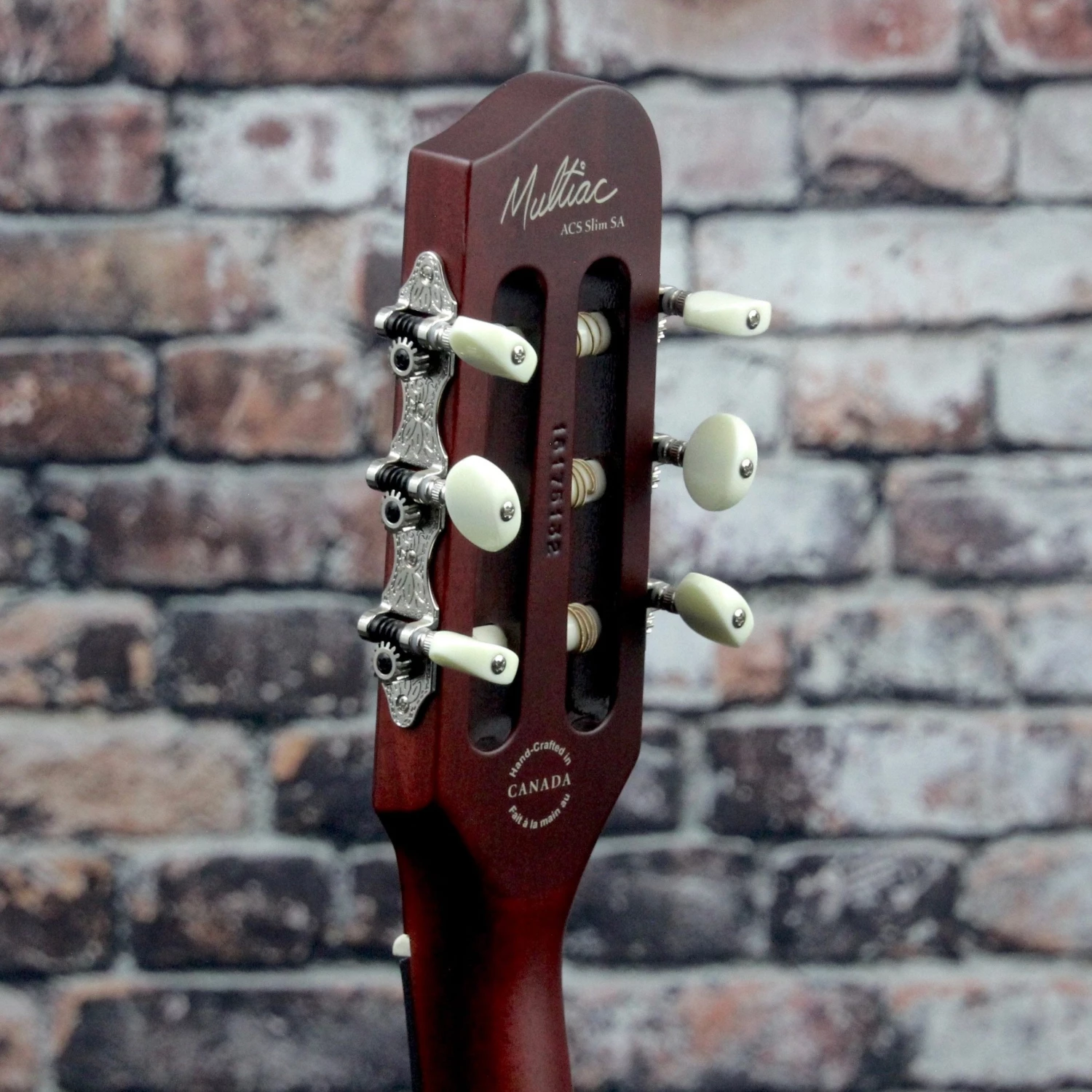 ‘Slim’ refers to the 1.715″ nut width, which is a mere 16th of an inch wider than the nut width on our standard electric guitars. If you do most of your playing on a guitar with a fairly narrow neck (most solid body electric guitars) this is the ACS-SA for you. The slim neck of this guitar along with our Ergocut shaping technique and 16″ fingerboard radius make for a very easy transition for steel string guitar players looking to integrate nylon string guitar sounds into their music. Aside from the new neck, the ACS-SA Slim shares all of the same features that have made the ACS-SA an industry standard. The chambered silver leaf maple body and cedar top result in an instrument that is virtually free of feedback, making it easy to use even in loud stage situations.