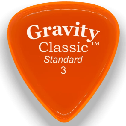 Gravity Picks classic is a traditional teardrop-style guitar pick. These unique acrylic picks provide a brighter and louder attack over more traditional plastic picks. The classic is slightly wider at the grip end to make it easier to hold on to and prevent slippage.