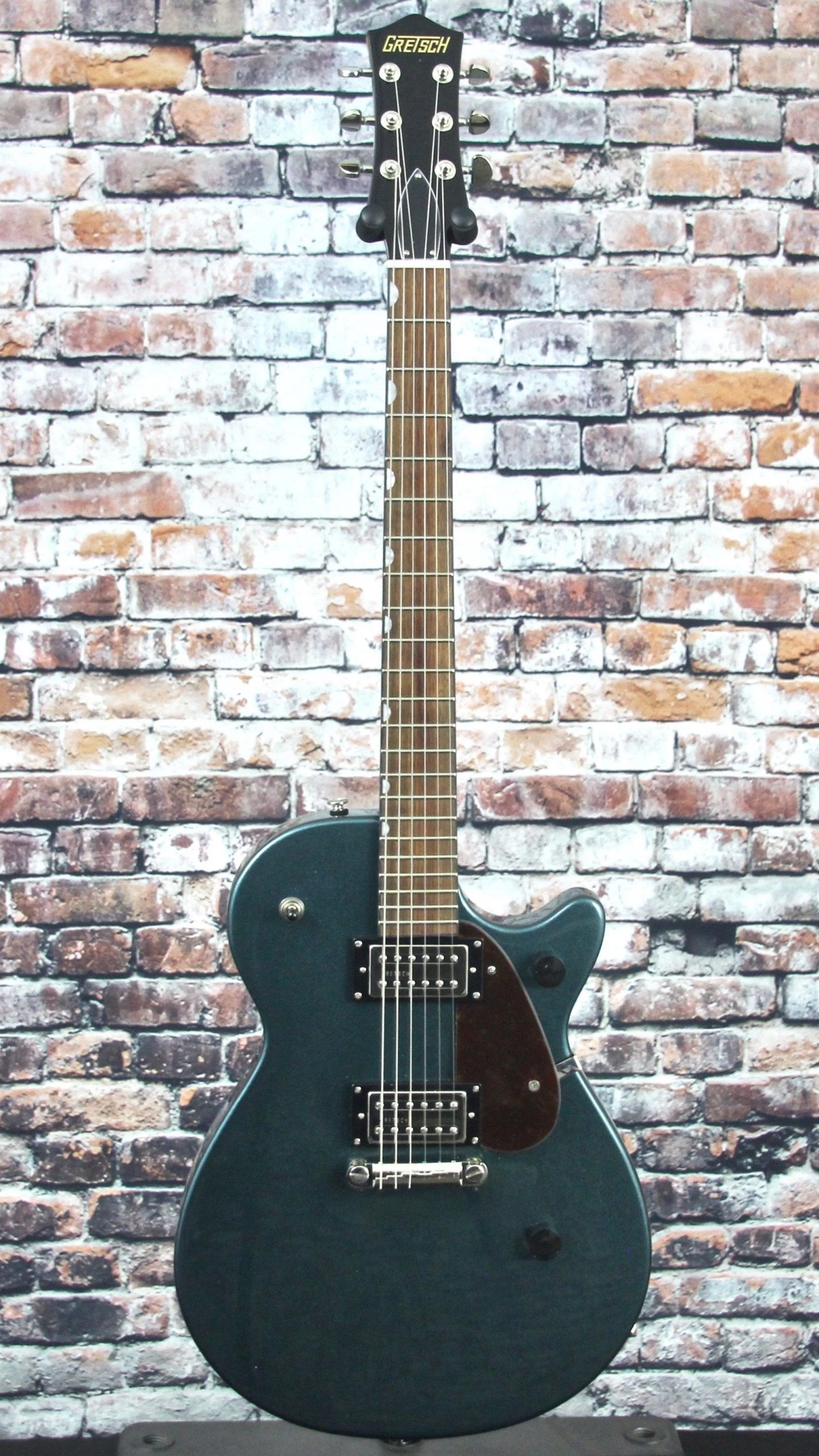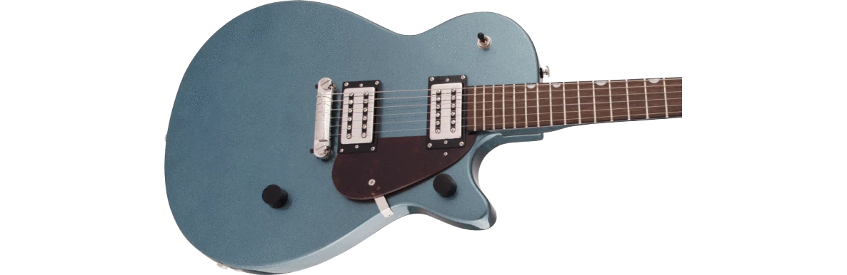 Dressed in stylish finishes including Golddust, Gunmetal, Imperial Stain and Vintage White, the G2210 also features an anchored compensated wrap-around bridge, synthetic bone nut, bound neck, vintage-style control knobs, tortoise pickguard and nickel hardware.