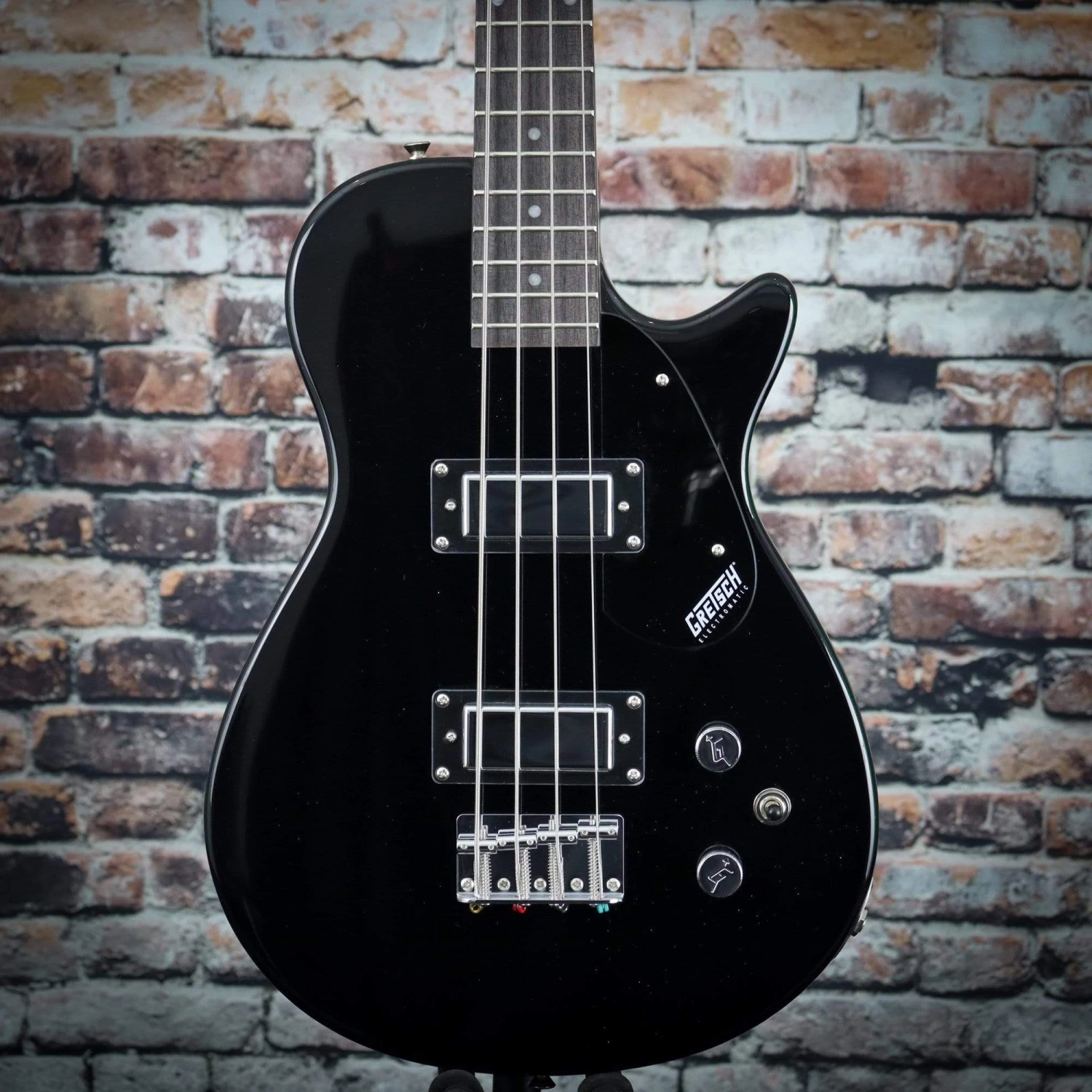 Key features include a shorter scale (30.3″), walnut fingerboard with 20 medium jumbo frets, two Gretsch mini dual-coil bass humbucking pickups, four-saddle bridge, black pickguard with Gretsch logo, synthetic bone nut and die-cast tuners.