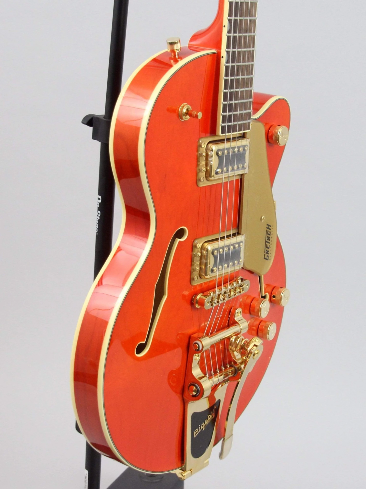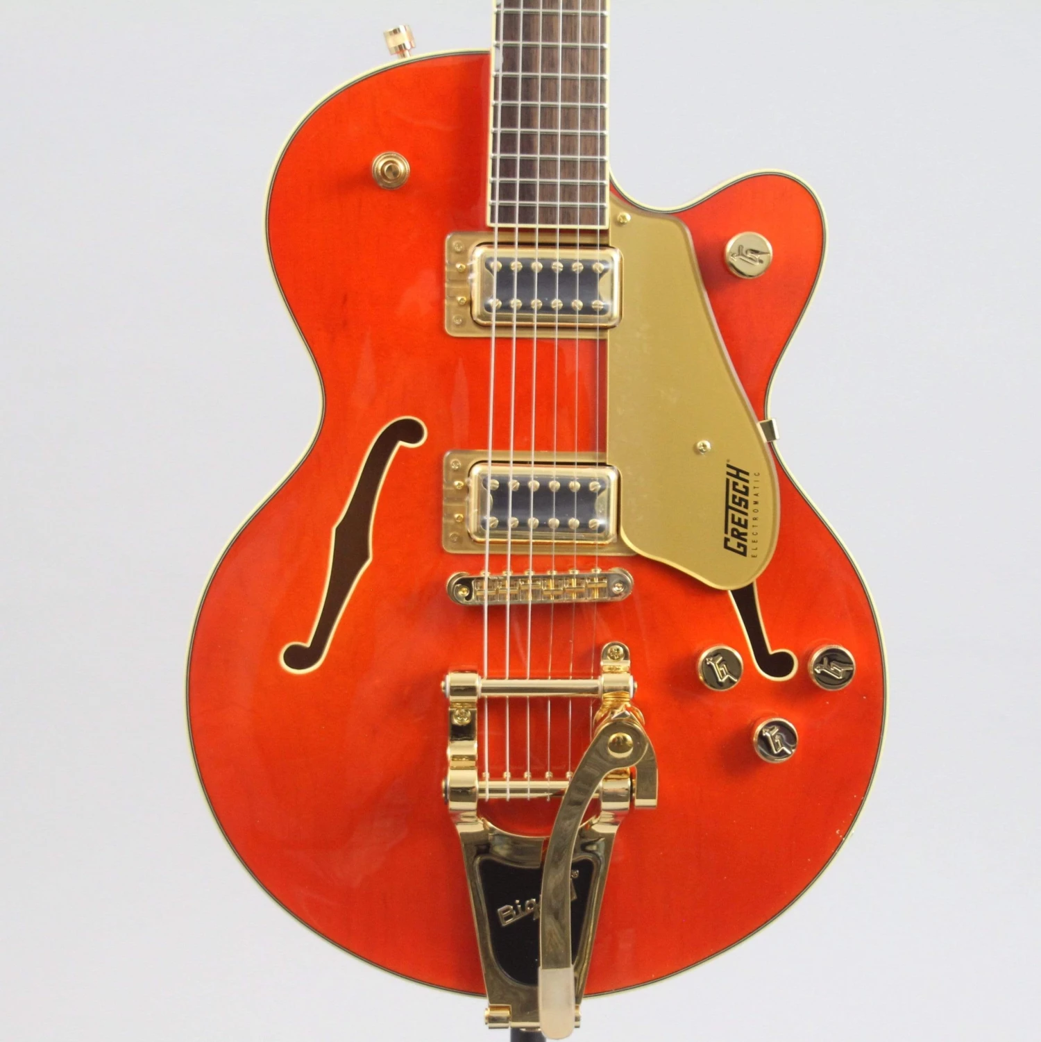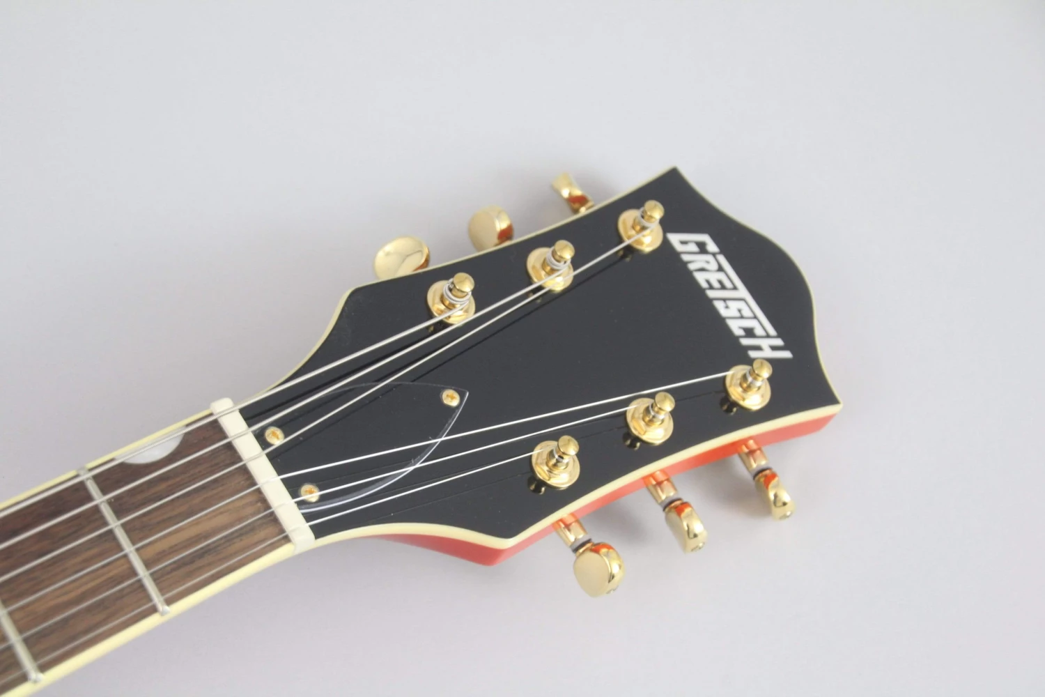 The G5655TG Electromatic® Center Block Jr. Single-Cut with Bigsby® and Gold Hardware features a smaller-sized body with a chambered spruce center block for dynamic resonance, high gain power and lightweight comfort.