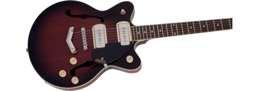 Classic ‘50s and ‘60s Gretsch eye-catching style is also here—all-new “radio arrow” control knobs, enlarged F-holes for increased acoustic projection, stylized pickup bezels, elegant aged white binding with upgraded purfling, one-ply black pickguard, slick-looking nickel hardware and standout finishes including Brownstone and Claret Burst. Easy to play while rocking out thanks to its smaller 14” body, the G2655-P90 is a phenomenal instrument for the modern musician who wants to control the stage and the audience while standing out from the pack.