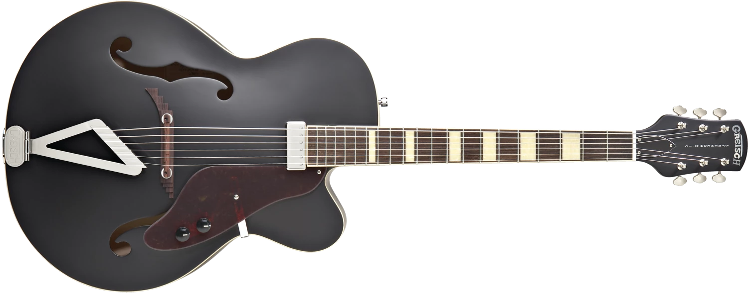 Reminiscent of the early Synchromatic™ of the 1940s, the G100CE Synchromatic Cutaway acoustic-electric features an arched spruce top with parallel tone bar bracing, body binding, F-holes, three-piece maple neck, bound rosewood fingerboard with extra-broad frets and vintage-style pearloid wide-block inlays, single-coil Gretsch® pickup, pickguard-mounted volume and tone controls, ’40s-era Synchromatic headstock shape and vintage-style pearloid Gretsch headstock logo inlay, height-adjustable Synchromatic bridge and chromatic tailpiece.