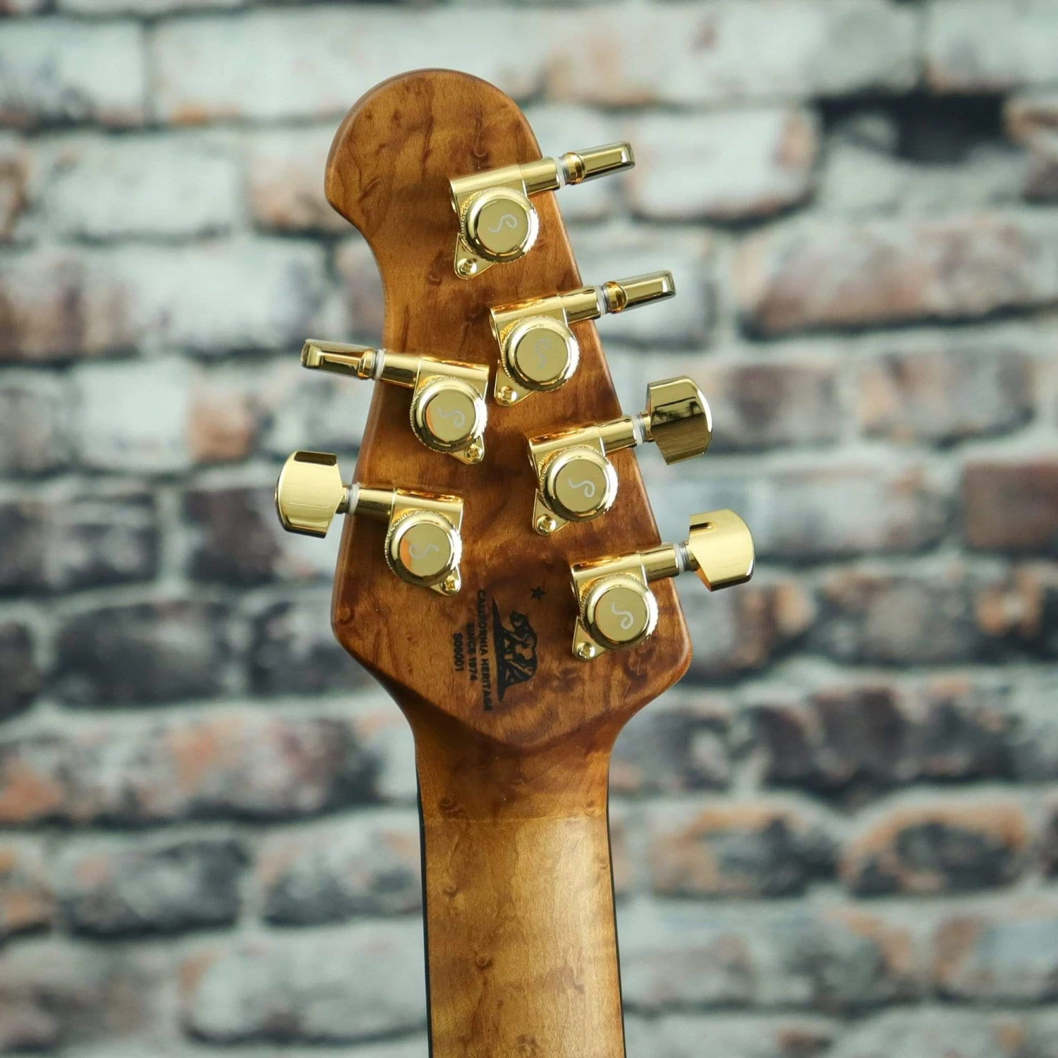 This Cutlass features two Music Man custom humbucker pickups, 24 Stainless Steel frets, Alder Body, Natural Flame Maple body binding, Figured Roasted Maple Neck, and a custom Music Man silent circuit for noise-free tone.