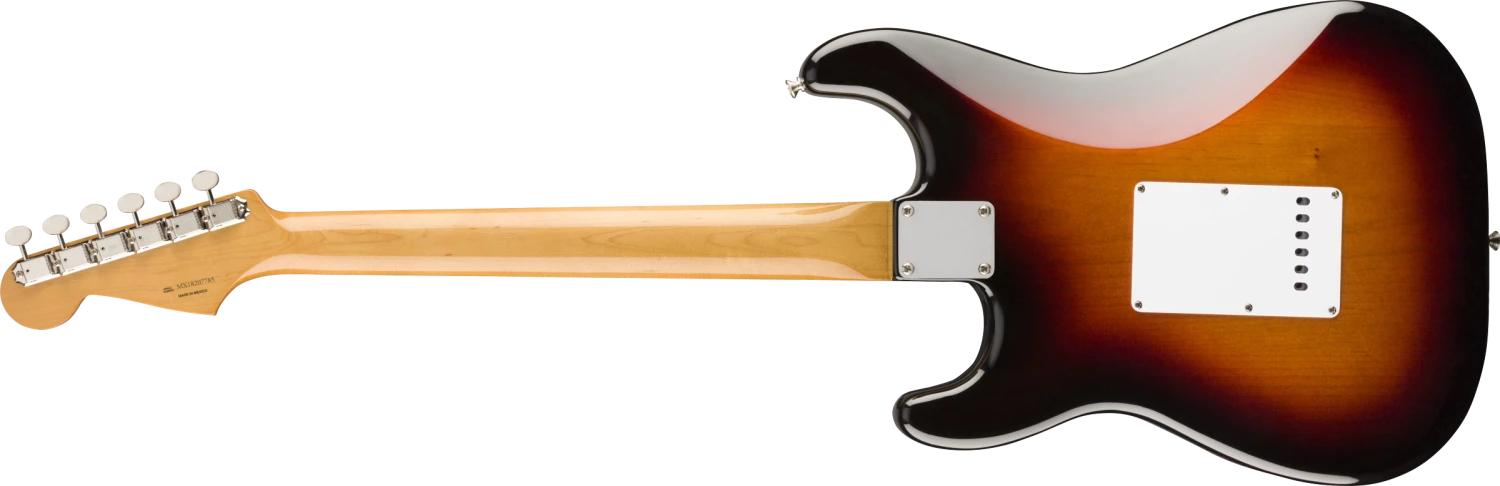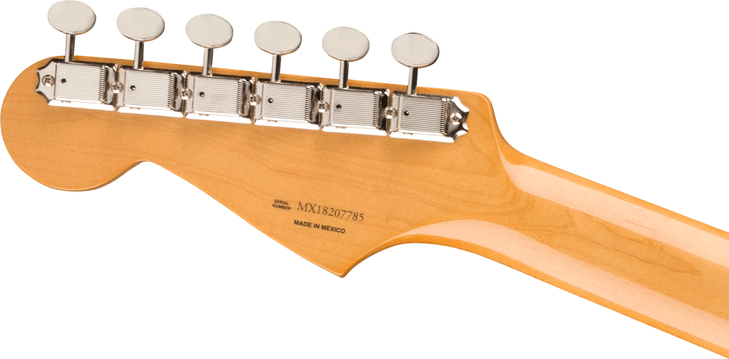 For authentic, vintage-style tone we recreated the trio of single-coil Stratocaster pickups to sound more like the originals. Crystalline and bell-like, they have the crisp, articulate tone that put Fender on the map. The “Mid 60s C”-shaped neck has a 7.25”-radius fingerboard with 21 vintage-style frets for classic playing feel. A vintage-style, six-point synchronized tremolo and vintage-style tuning machines offer original-era aesthetics, rock-solid performance and tuning stability. Other features include vintage-style strap buttons, chrome hardware and four-bolt neck plate. Includes a deluxe gig bag.