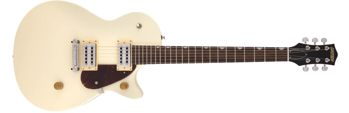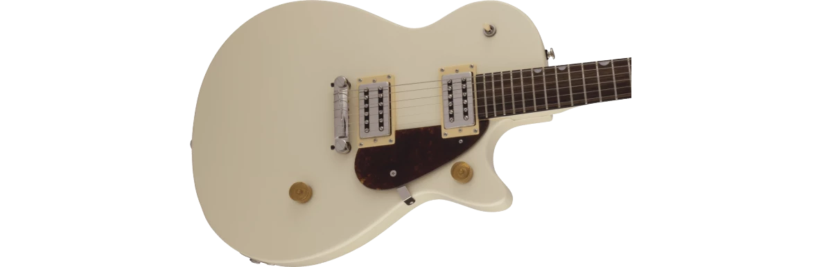 Dressed in stylish finishes including Golddust, Gunmetal, Imperial Stain and Vintage White, the G2210 also features an anchored compensated wrap-around bridge, synthetic bone nut, bound neck, vintage-style control knobs, tortoise pickguard and nickel hardware.