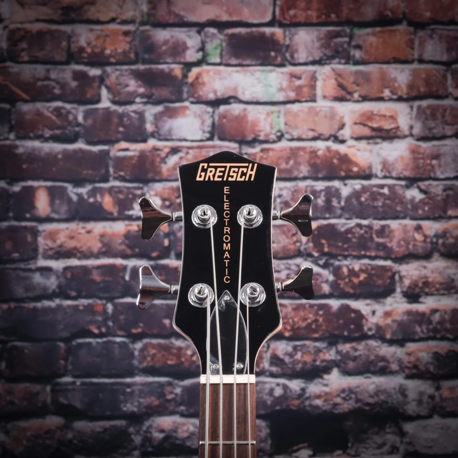 Its key features include a 30.3”-shorter scale length for comfortable playability, basswood body, bolt-on maple neck, 12”-radius black walnut fingerboard with 20 medium jumbo frets and dot inlays. A pair of Gretsch mini dual-coil bass humbucking pickups deliver thundering sound, which can be commanded with a three-position pickup toggle switch, master volume and master tone.