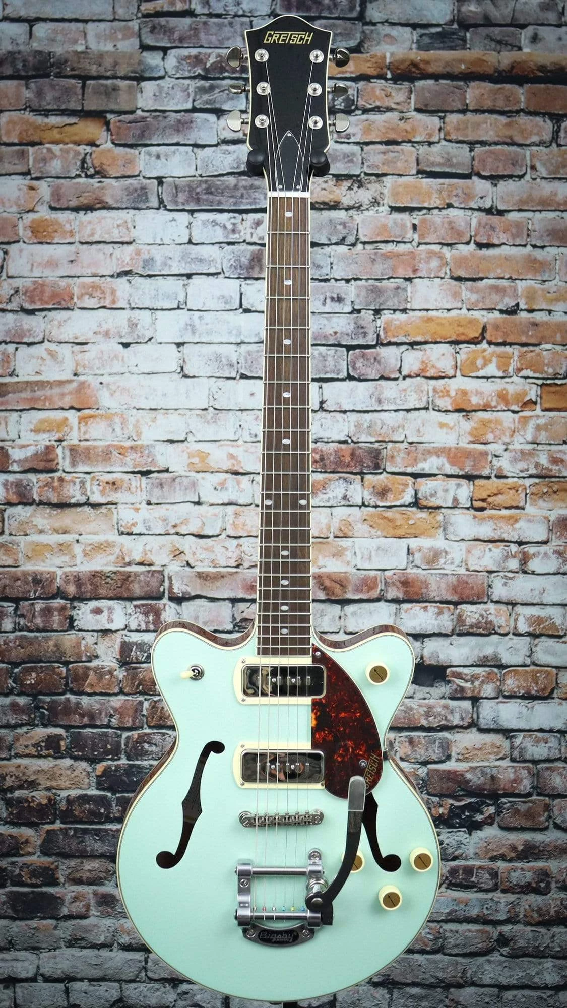 Classic ‘50s and ‘60s Gretsch eye-catching style is also here—all-new “radio arrow” control knobs, enlarged F-holes for increased acoustic projection, stylized pickup bezels, elegant aged white binding with upgraded purfling, one-ply tortoise pickguard, slick-looking nickel hardware and standout finishes including Two-Tone Midnight Sapphire and Vintage Mahogany Stain, Two-Tone Mint Metallic and Vintage Mahogany Stain or Two-Tone Sahara Metallic and Vintage Mahogany Stain. Easy to play while rocking out thanks to its smaller 14” body, the G2655T-P90 is a phenomenal instrument for the modern musician who wants to control the stage and the audience while standing out from the pack.