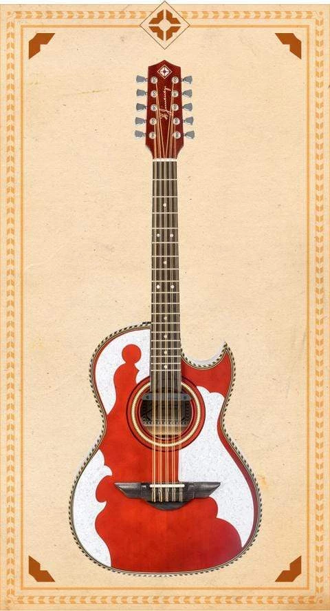 El Patrón – LBQ4ETR Bajo Quinto The three H. Jimenez white pearloid micas on the trans red top give this bajo quinto a rich vibrant look. The back and sides are stained red as well, the solid headstock is highlighted by individual sealed machine heads and like all H. Jimenez bajos it has the signature “Thunderwing” ™ bridge, a pickup with volume control, padded gig bag and a lifetime warranty.