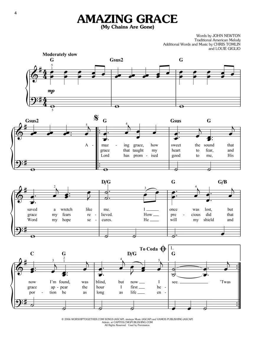 50 worship favorites for beginning pianists to learn, including: Amazing Grace (My Chains Are Gone) • Blessed Be Your Name • Come, Now Is the Time to Worship • Forever • Here I Am to Worship (Light of the World) • In Christ Alone • Lord, I Lift Your Name on High • Mighty to Save • Open the Eyes of My Heart • Shout to the Lord • 10,000 Reasons (Bless the Lord) • Thy Word • We Fall Down • You Are My King (Amazing Love) • Your Name • and many more.