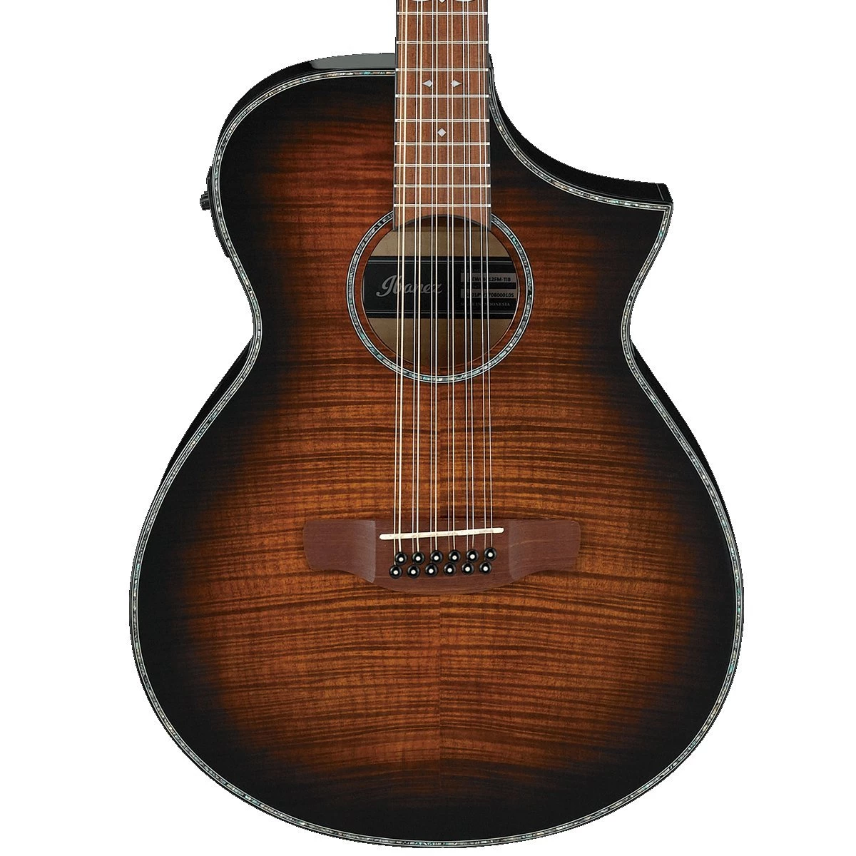 Ibanez AE guitars have been a mainstay on stages big and small for years. An affordable, easy-to-use solution for when you need an acoustic guitar that delivers a great amplified sound and looks good doing it. The AEWC4012FM is a Concert style 12-string acoustic guitar with built-in pickup. Sporting a beautiful Tigerseye Burst, the flamed maple top, back and sides add brightness and clarity to balance the naturally warm, round tone created by a Concert body style. This solid performer also includes a rosewood bridge and fretboard, Abalone rosette and chrome die-cast tuners. Electronics include a Fishman Sonicore pickup partnered with an Ibanez AEQ-SP2 preamp with built-in tuner. This system beautifully reproduces the full, lush sound that only a 12-string can create.