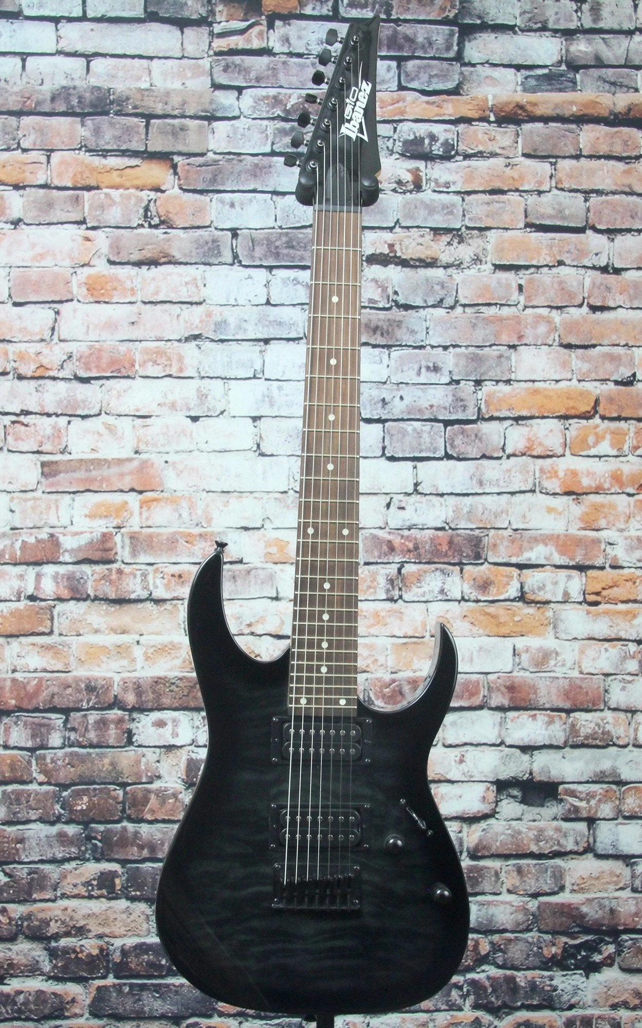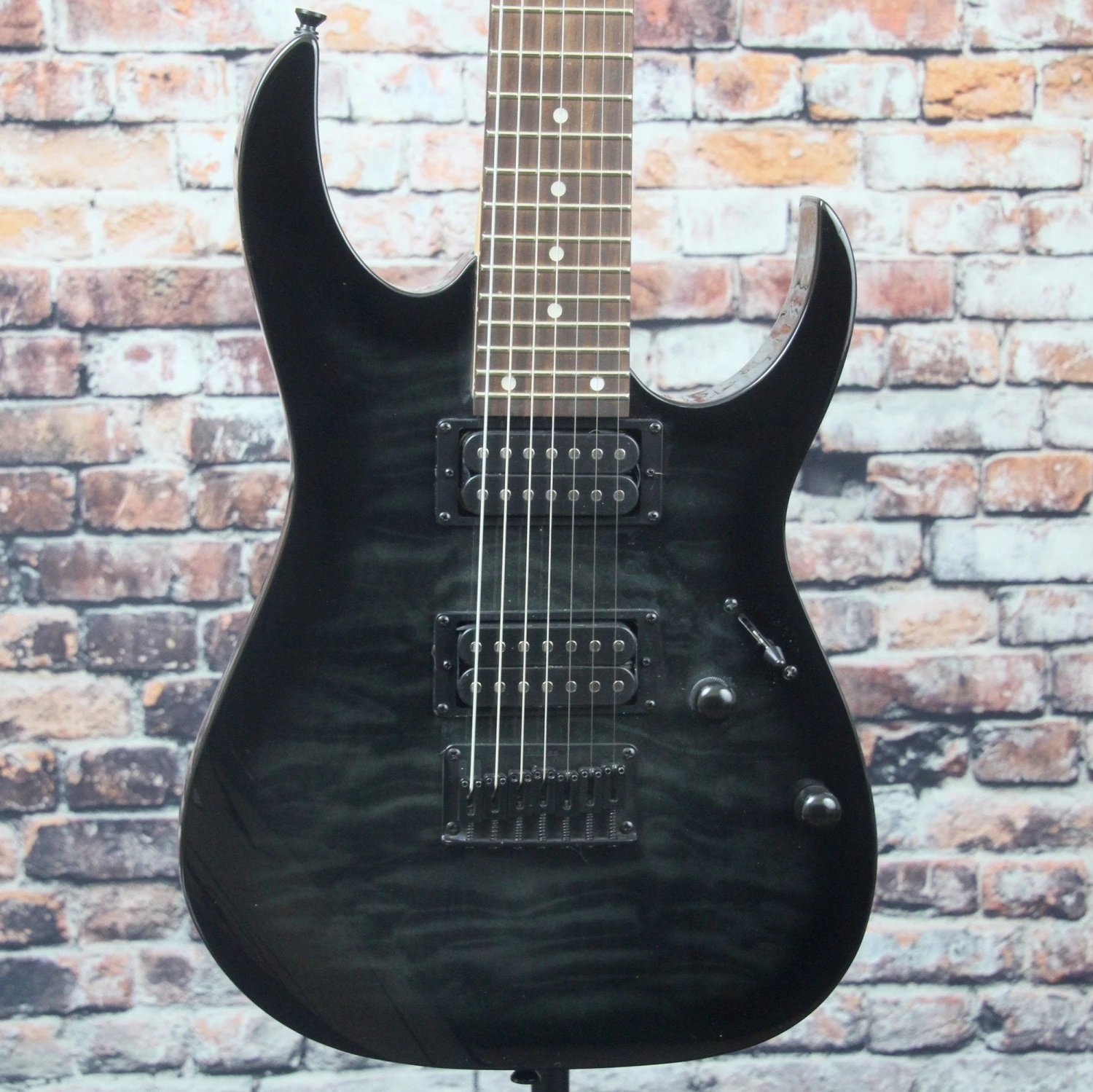 Patterned after the RG, the legendary Ibanez metal monster, the GRG is the affordable gateway to that same combination of speed, fury and expression. This GRG’s Poplar body with Quilted Maple Art Grain top is cloaked in a high gloss finish and complemented by a Treated New Zealand Pine fretboard equipped with string-bending-friendly jumbo frets. Proprietary Infinity R7 humbucking pickups deliver the requisite fat, distorted tone that metal rockers crave, while the Ibanez Fixed 7 bridge helps take your playing to a whole other level.