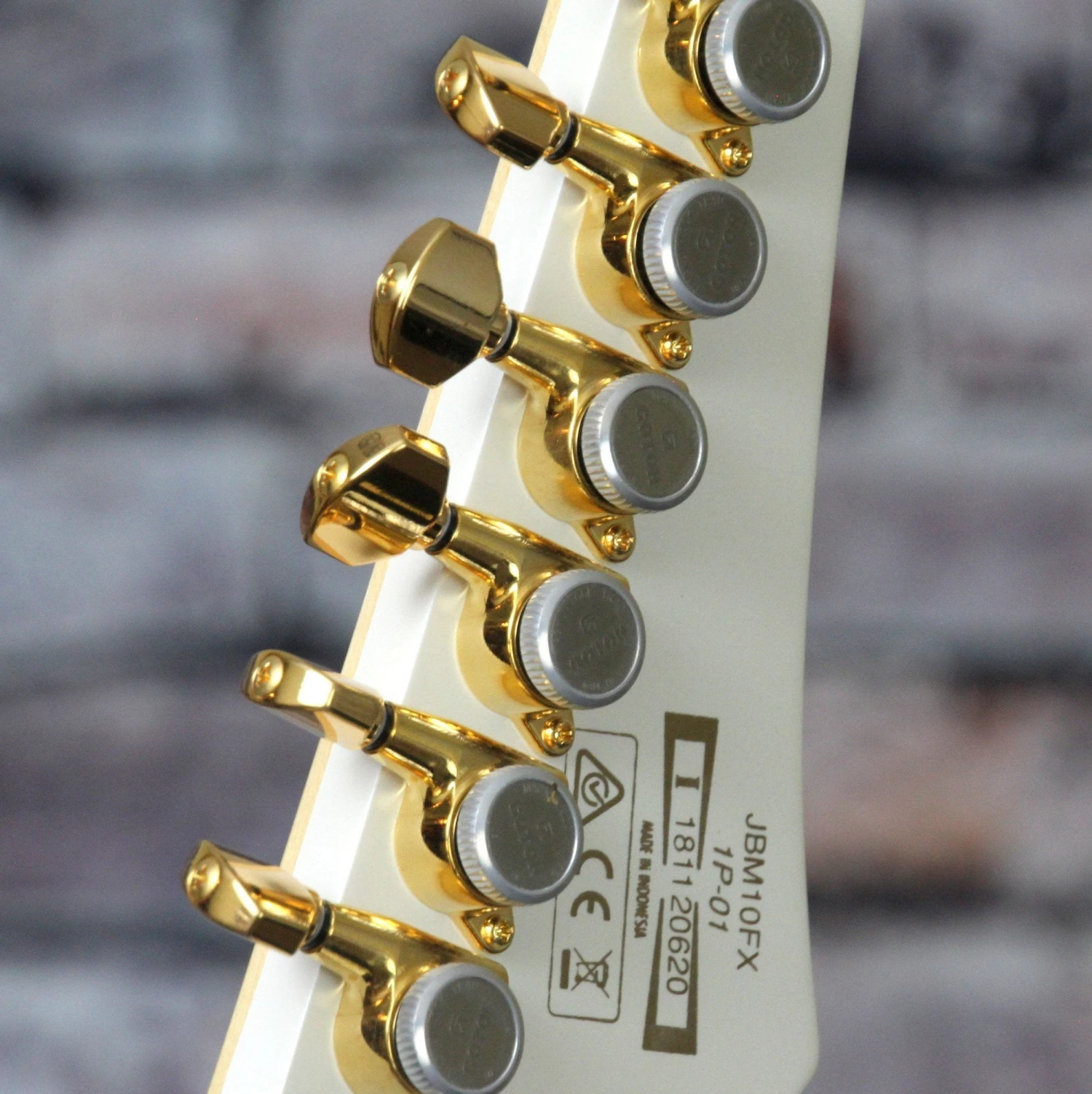 Just as each new Periphery release seems to turn progressive metal around another 180 degrees, Jake Bowen, the source of the band’s rich tapestry of guitar-based ambient soundscapes, has also moved the boundaries of guitar design and performance with his new Ibanez signature instrument—the JBM10FX. Using the Ibanez RGA as a foundation, Bowen’s departures from that iconic instrument are many. The JBM10FX’s Maple Wizard III neck allows for warp-speed fretboard work and smooth access to the upper frets. The JBM10FX features a bound Jatoba fretboard with jumbo frets that bears Jake’s own custom inlay at the 12th fret. Add a reverse headstock for yet another striking element of visual distinction. The key feature of the JBM10FX is its fixed bridge design, a first for the Ibanez JBM series. Jake chose the Gibraltar Standard II Bridge, designed to provide optimal transfer of each string’s vibration through the guitar body. Its smooth surface also maximizes playing comfort. Gotoh® MG-T locking machine heads provide superior tuning stability and help to expedite string changes. The JBM10FX also features Jake’s signature DiMarzio® Titan™ pickups, developed under Jake’s supervision. Jake describes them as, “the perfect combination of tight and aggressive.” The JBM10FX ships tuned to drop-C (1D, 2A, 3F, 4C, 5G, 6C).