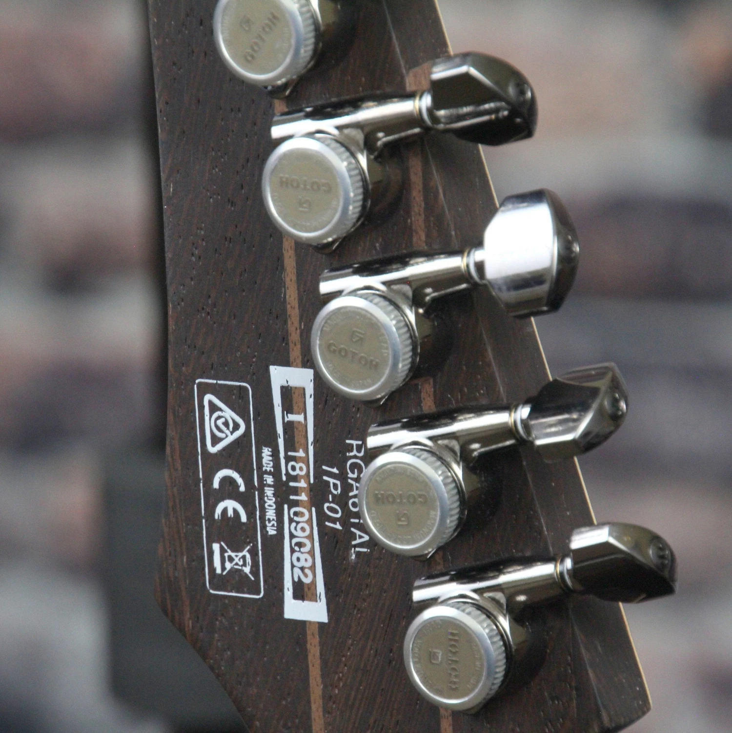 The RGA61AL features a Macassar Ebony fretboard that provides a tight low end with quick response. The super-thin and ultra-playable Nitro Wizard 5-piece Panga Panga/Walnut neck is as smooth and comfortable. Sub Zero treated frets can stand up against the hardest riffing and string-bending. The luminescent side dot inlays make it easy for players to perform on dark stages and match the dazzling luminescent Ibanez headstock logo. Bare Knuckle Aftermath pickups deliver a bright and wickedly expressive tone, transmitting a quick bottom-end response for picking and fast riffing along with a dynamic midrange and precise high-end articulation. The coil-tap switch unleashes the Aftermath pickup’s full output (for a modern voice) or a lower output signal (for a vintage tone). The Gibraltar Standard II enables the optimal transfer of each string’s vibration. The Gotoh® locking tuners provide tuning accuracy and allow for quick, efficient string changing and the Schaller S-Lock strap lock pins hold a strap securely but make it easy to put the strap on and take off quickly.