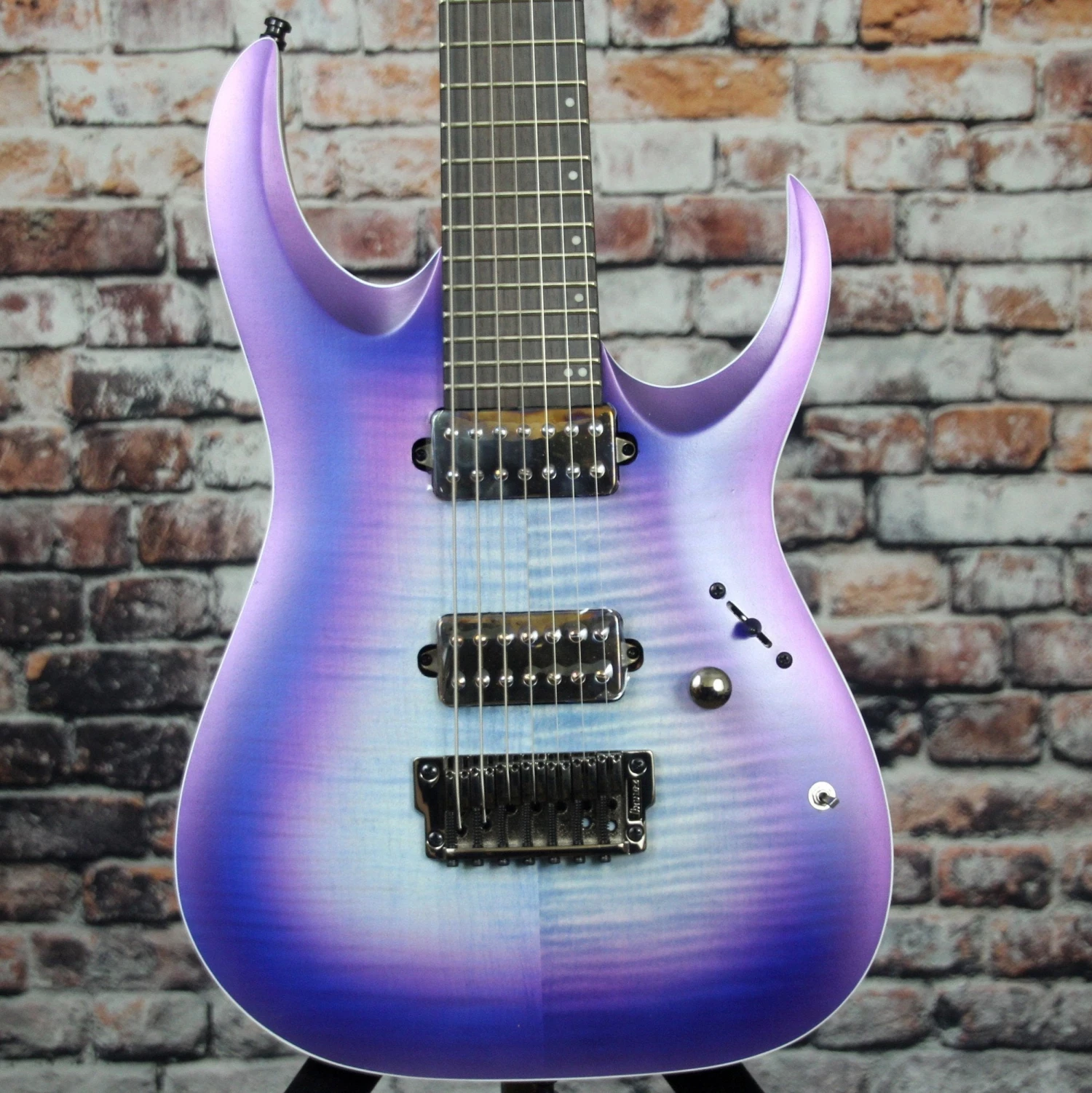 The Axion Label was made for metal, but offers even more for the adventurous players out there. The Axion Label models feature forward-looking developments in sound, playability and looks that take performances higher, deeper and heavier. Arm yourself with the Axion Label and get ready to break some new ground. The RGA71AL features a Macassar Ebony fretboard that provides a tight low end with quick response and the extremely rigid, super-thin and ultra-playable Nitro Wizard 5-piece Panga Panga/Walnut neck substantially increases sustain. The Sub Zero treated frets can stand up against the hardest riffing and string-bending. The luminescent side dot inlays make it easy for players to perform on dark stages and match the dazzling luminescent Ibanez headstock logo. Bare Knuckle Aftermath pickups deliver a bright and wickedly expressive tone, transmitting a quick bottom-end response for picking and fast riffing along with a dynamic midrange and precise high-end articulation. The coil-tap switch unleashes the Aftermath pickup’s full output (for a modern voice) or a lower output signal (for a vintage tone). The Gibraltar Standard II enables the optimal transfer of each string’s vibration. The Gotoh® locking tuners provide tuning accuracy and allow for quick, efficient string changing and the Schaller S-Lock strap lock pins hold a strap securely but make it easy to put the strap on and take off quickly.