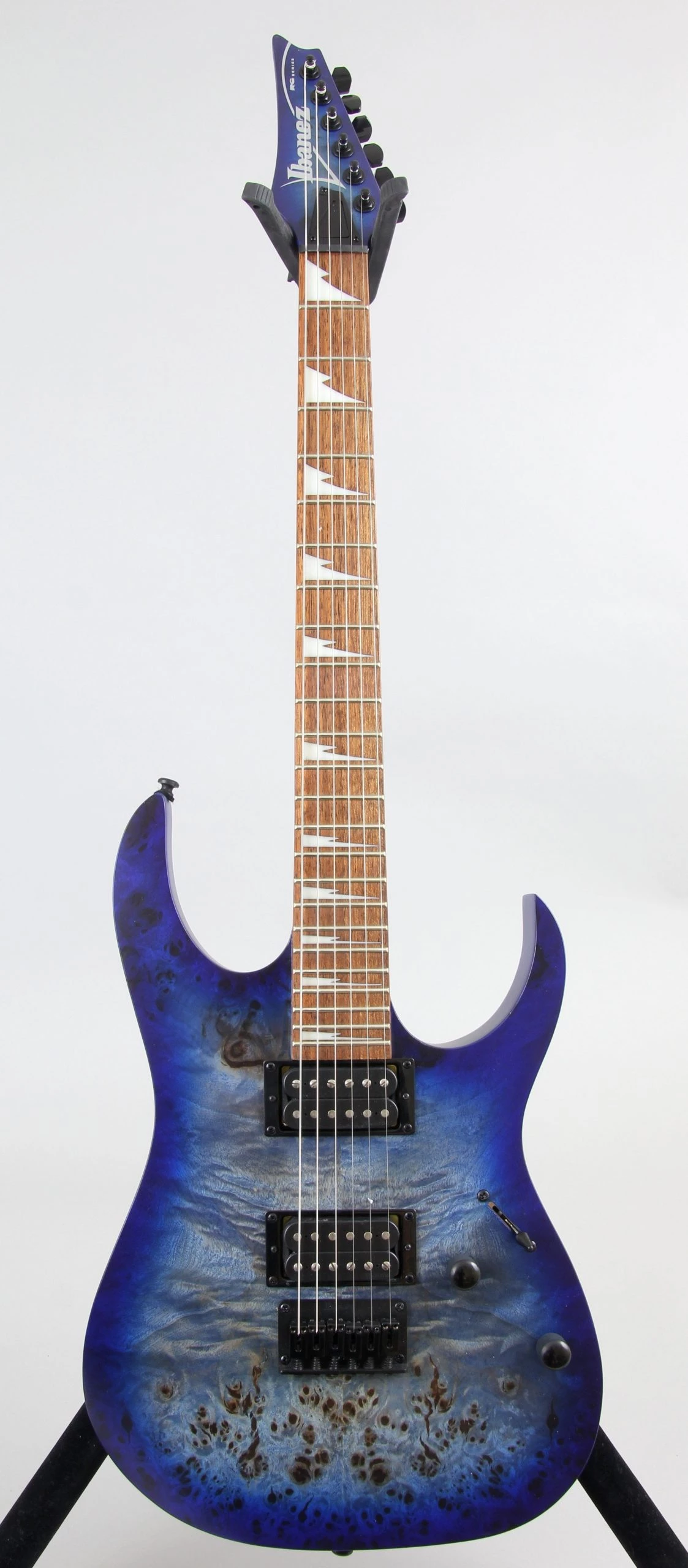 The RGRT621DPB features a neck-through design, reverse headstock and stunning poplar burl top. The Wizard III 5pc Maple/Walnut through constructed neck contributes to its massive sustain and smooth access to high fretboard positions. The Poplar Burl top gives an exotic feel, and reverse headstock adds another element of visual distinction. DiMarzio® Air Norton™ and The Tone Zone® pickups were chosen for the inspiring way they complement each other to create a wide pallet of tonal options that add fire and improve sustain, yet retain clarity. Wired through a 5-way selector switch, they can be combined in a variety of configurations that offer numerous tonal options. A simple, yet solid fixed bridge provides stable, dependable tuning and accurate intonation.