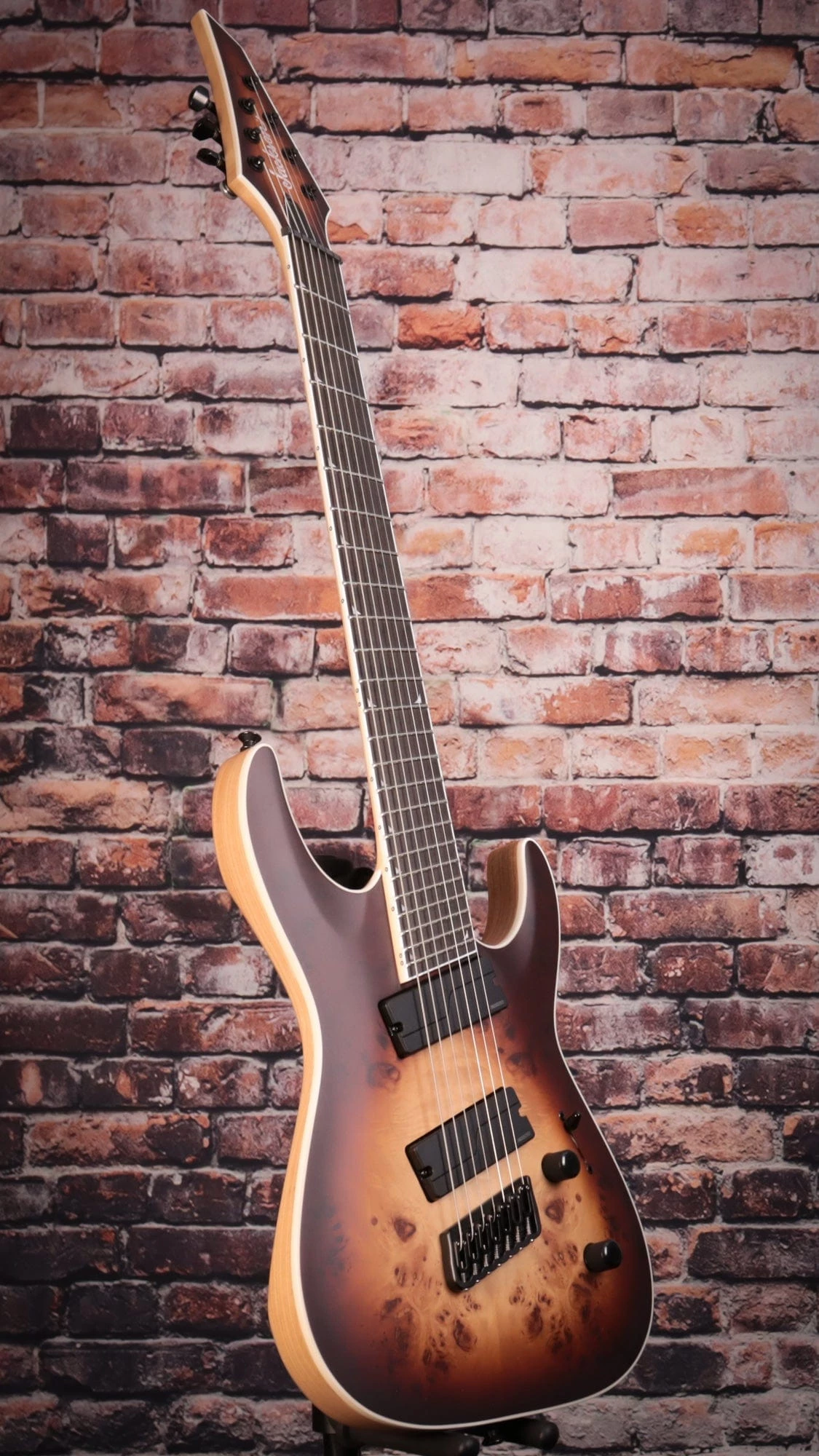 Swathed in sinister Jackson style, the Concept Series Soloist SLAT7P HT MS comes in Satin Bourbon Burst with all-black hardware including Gotoh® tuners and Dunlop® dual-locking strap buttons, Graph Tech® TUSQ® XL nut, distinctive pearloid piranha tooth inlays and color matched reverse Jackson AT-1 3×4 black headstock.