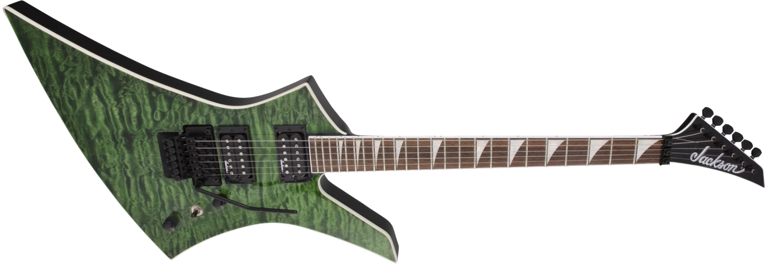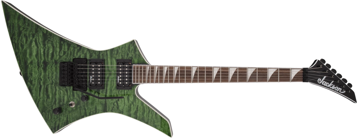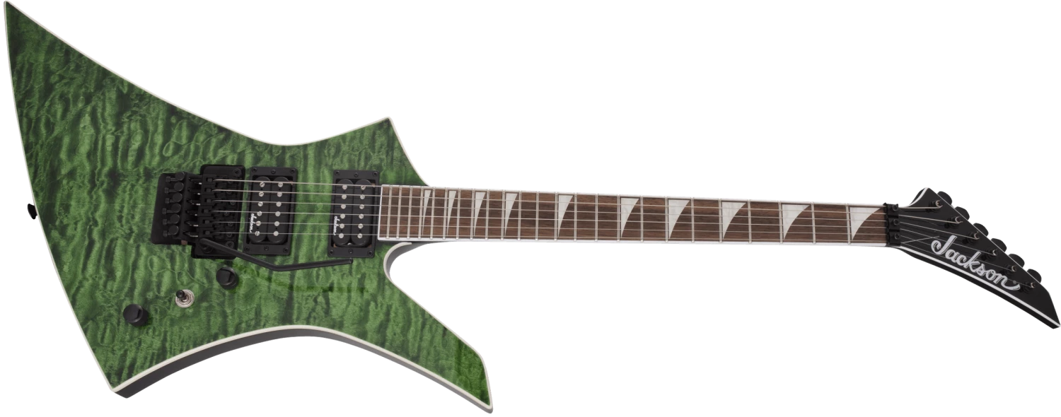 This metal-worthy axe is available in a Cherry Burst finish with white binding and chrome hardware or in a new sophisticated Transparent Green finish with white binding and black hardware. Both models feature a Jackson pointed 6-in-line black headstock.
