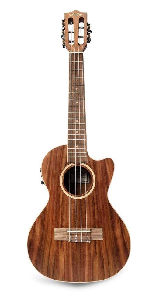 An Acacia Solid Top 5 string (high and low G) cutaway electric tenor ukulele is fitted with a wide comfortable neck, select figured woods, open back tuners, wood marquetry, NuBone XB nut and saddle, satin finish, a padded gig bag and a Limited Lifetime Warranty. Acacia resonates with a full rich tone and has a traditional look. The solid top enhances tone and increases projection. The Fishman pickup with tuner make this an ideal ukulele for stage or recording.
