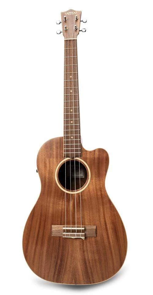A Lanikai Acacia Solid Top baritone cutaway electric ukulele is appointed with a truss rod for easy action adjustments, wider nut for player comfort, select figured woods, open back tuners, wood marquetry, NuBone XB nut and saddle, DAddario strings, satin finish, a padded gig bag and a Limited Lifetime Warranty. Acacia resonates with a full richness and has a traditional look. The solid top enhances tone and increases projection. The Fishman pickup with tuner make this an ideal instrument for stage or recording.