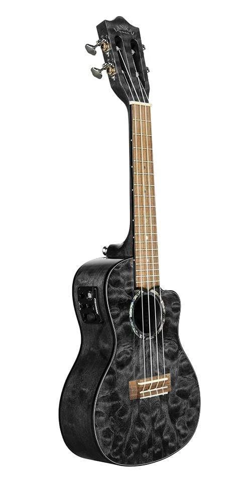 A Lanikai Quilted Maple cutaway electric concert ukulele in trans black provides a wider nut for player comfort, select figured wood, Grover open back tuners on a slotted headstock, multi-ply black ABS body binding, NuBone XB nut and saddle, DAddario strings, Fishman Kula preamp and tuner, glossy finish, foam case and a Limited Lifetime Warranty. From an intimate acoustic stage to a concert stage a Lanikai quilted maple series is an excellent choice for performance. Built as a reliable go-to ukulele, a quilted maple Lanikai is favored by artists around the globe.