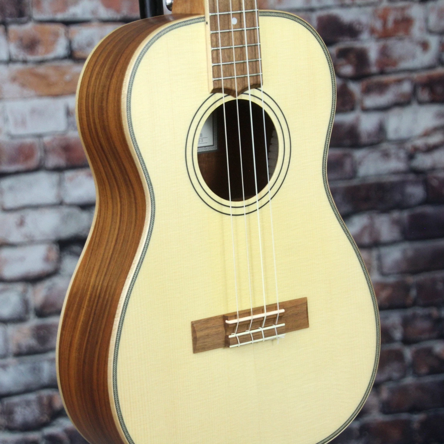 The Solid Spruce Top ukulele by Lanikai has dynamic new features such as a wider nut for player comfort, select woods, Grover® open back tuners, wood marquetry, NuBone XB® nut and saddle, D’Addario®strings, satin finish, a padded gig bag and a Limited Lifetime Warranty.