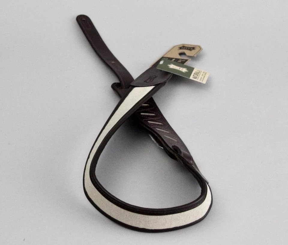 - Levy’s 2 1/2″ natural hemp guitar strap with padding wrapped in dark brown garment leather.