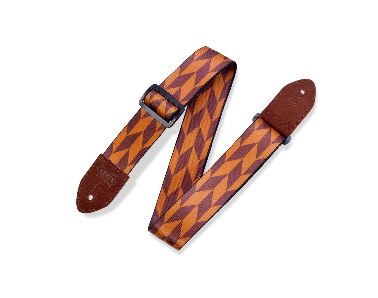 - One-ply printed polyester guitar strap with suede leather ends and vintage logo. Black plastic loop and slide hardware. Adjustable from 35″ to 60″.