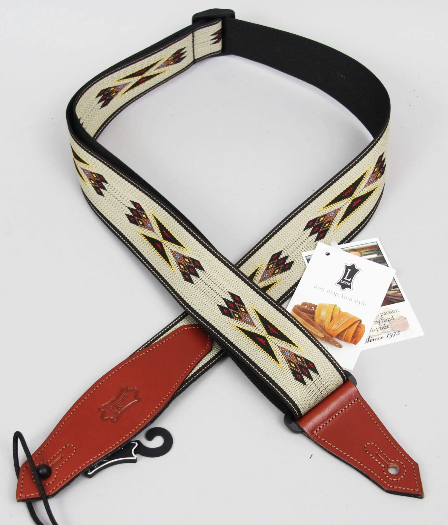 2″ polypropylene/jacquard weave guitar strap with leather ends and tri-glide adjustment. Adjustable to 62″. Also available in extra long (XL), which adds 12″ to overall length.