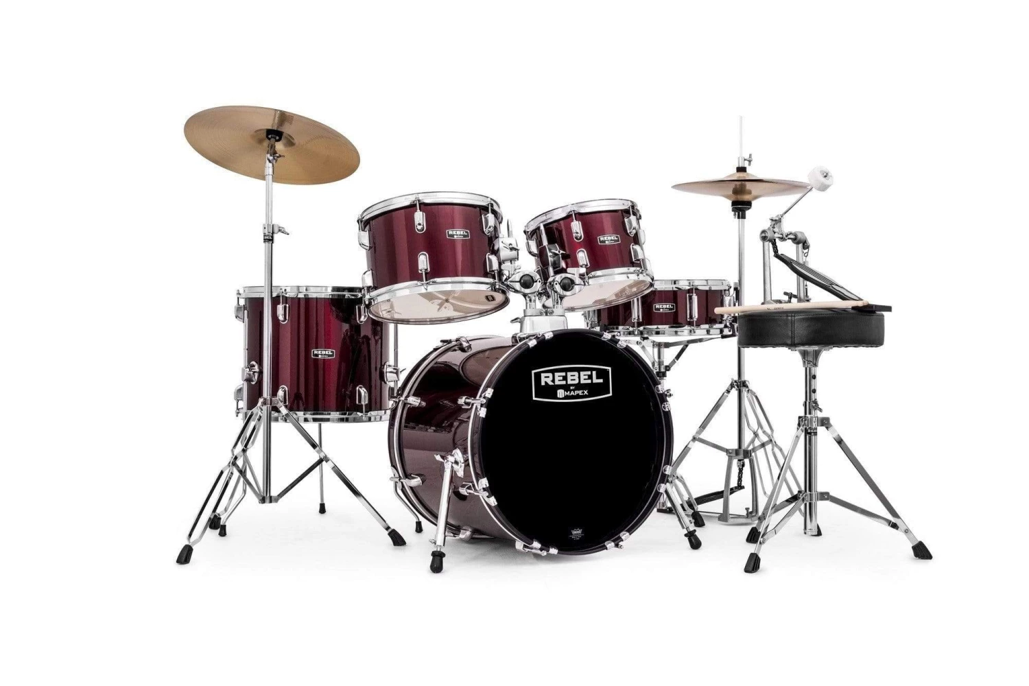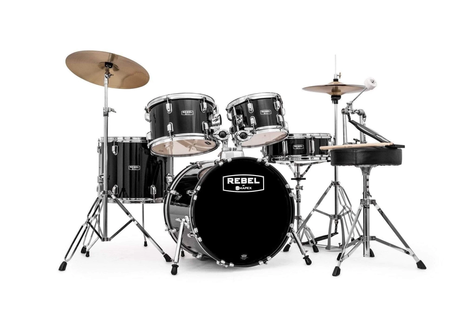 - The Rebel by Mapex series has poplar shells for full, solid tone with durable coverings.