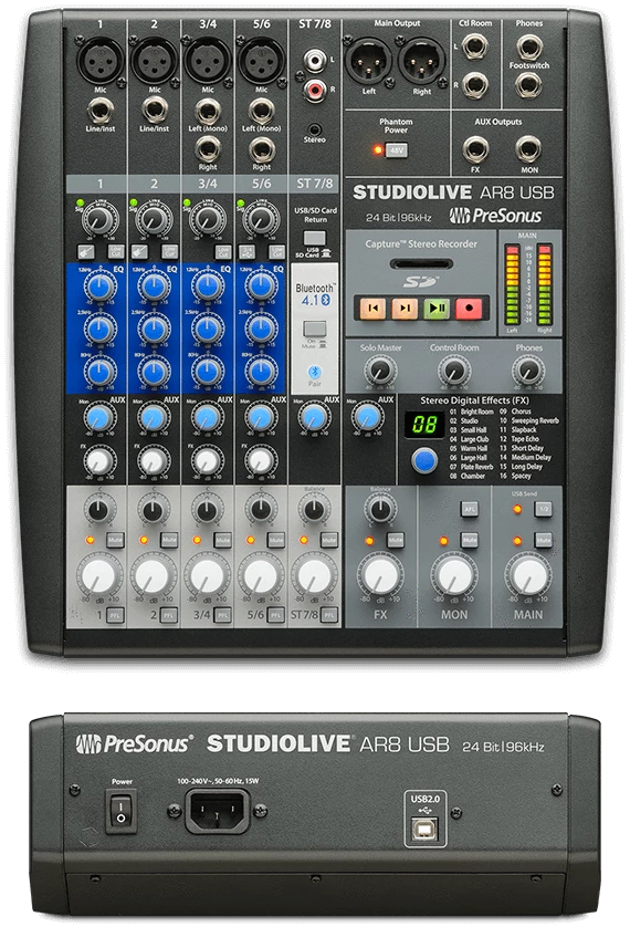 StudioLive® AR8 USB 8-channel hybrid mixers make it simple to mix and record live shows, studio productions, band rehearsals, podcasts, and much more. This is a musician’s mixer: lightweight, versatile, feature-rich, and packed with analog connections and digital tools, yet easy to learn and use. Mix with PreSonus’® famous Class A preamps and three-band EQ. Create multitrack recordings and fly in backing tracks with a 24-bit, 96 kHz, USB 2.0 digital audio interface. Record and playback in stereo with the integrated SD™ digital recorder. Stream program music wirelessly, using onboard Bluetooth®. Compact and road-ready, StudioLive AR mixers provide a superior all-in-one solution for mixing and recording your performances.
