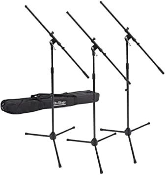 This pack of three of our height-adjustable MSP7703 Euro Boom Mic Stands is ideal for a touring band or mobile recording rig. This stand delivers exceptional stability in any setting, even on irregular surfaces. The removable boom arm adjusts in angle for precise mic placement, making it a versatile choice that excels in a variety of applications ranging from miking vocals to acoustic instruments to amps. The entire stand conveniently folds flat to facilitate storage and travel. This pack includes a rugged padded nylon bag with a shoulder strap and top handles for ergonomic transportation.