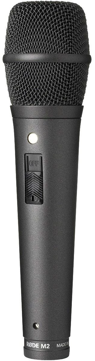 The Rode M2 microphone is truly a unique stage microphone. Step up your on stage vocal audio quality with a condenser microphone. A typical dynamic stage mic limits the tonal quality of the singer, while the super-cardioid M2 features a condenser element to ensure the highest quality possible. Apart from its great stage tone, this mic also features a lockable on-off switch which gives the performer the ability to control their microphone while on stage. An internal shock mount on the condenser element limits handeling noise while using the mic.