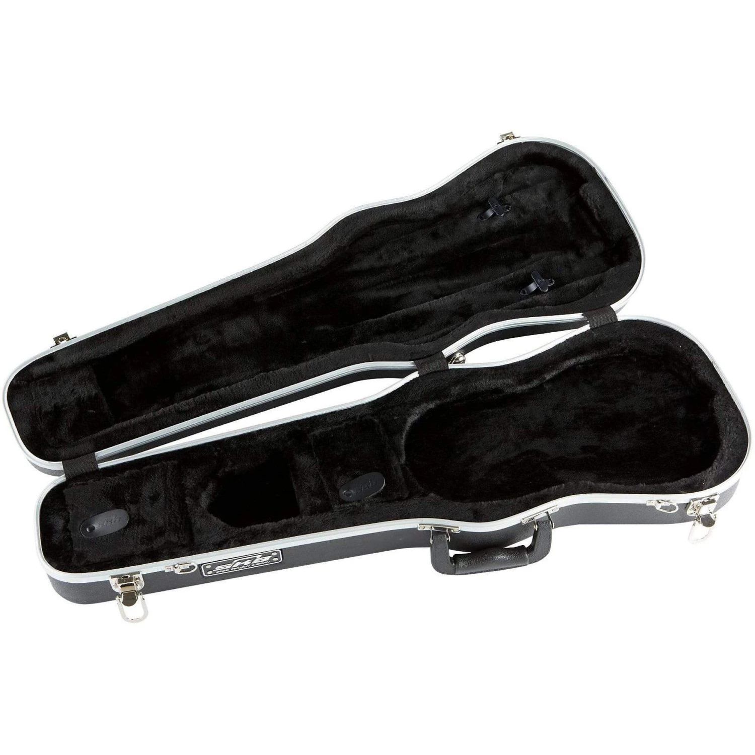 This case is designed to hold an array of sizes and models securely and with uncompromising protection. Lid holds two bows. Truly a revolution for instrument protection. Perfect fit valance with D-ring for strap.