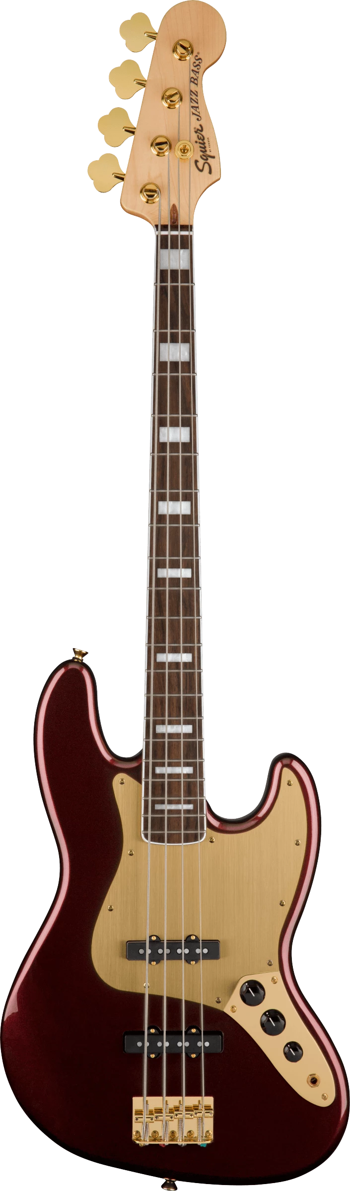 The Squier® 40th Anniversary Jazz Bass®, Gold Edition is a stylish model adorned with an eye-catching collection of upscale features for the discerning Squier fanatic. Featuring striking gold-plated hardware, a gold anodized aluminum pickguard, a bound Indian laurel fingerboard with pearloid block inlays, an engraved anniversary neck plate and gloss finish throughout, this J Bass® is poised and ready for the spotlight. Player-friendly refinements of this commemorative model include a slim and comfortable “C”-shaped neck profile for an easy playing feel, vintage-style tuning machines and 4-saddle bridge with barrel saddles for authentic performance and style, and Fender-Designed single-coil pickups with alnico 5 magnets for familiar J Bass tone.