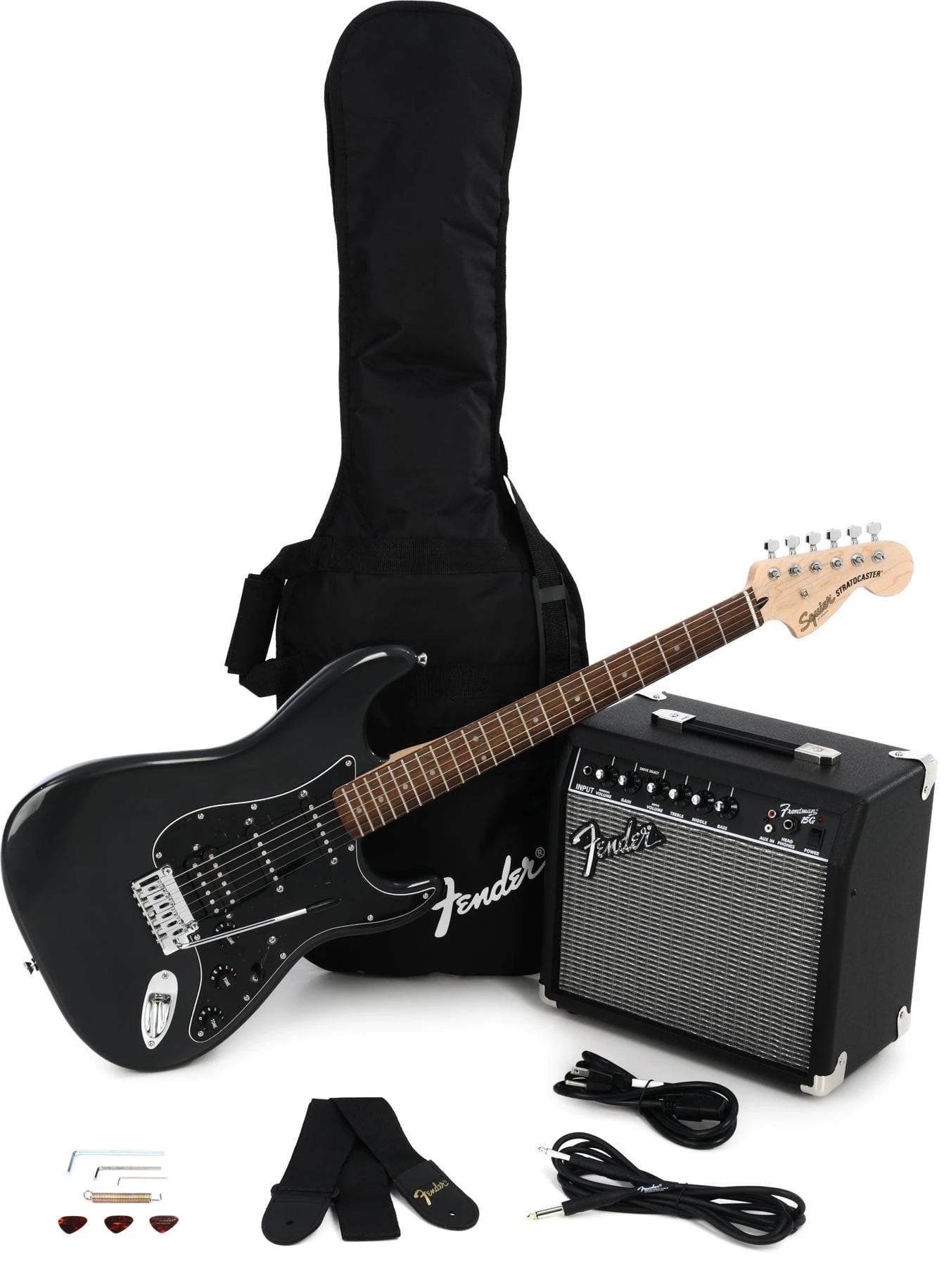 - Includes: free 3-month subscription to Fender Play, padded gig bag, Frontman™ 15G guitar amplifier, instrument cable, instrument strap, picks
