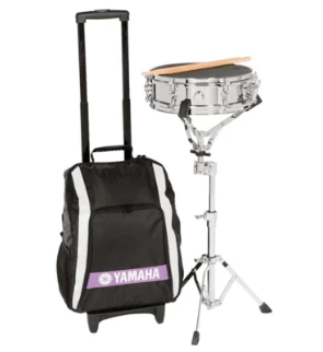 5-1/2″ x 14″ steel shell 10-lug snare drum with chrome finish and concert height snare drum stand, rubber practice pad, Yamaha drum sticks, and rolling soft backpack case.